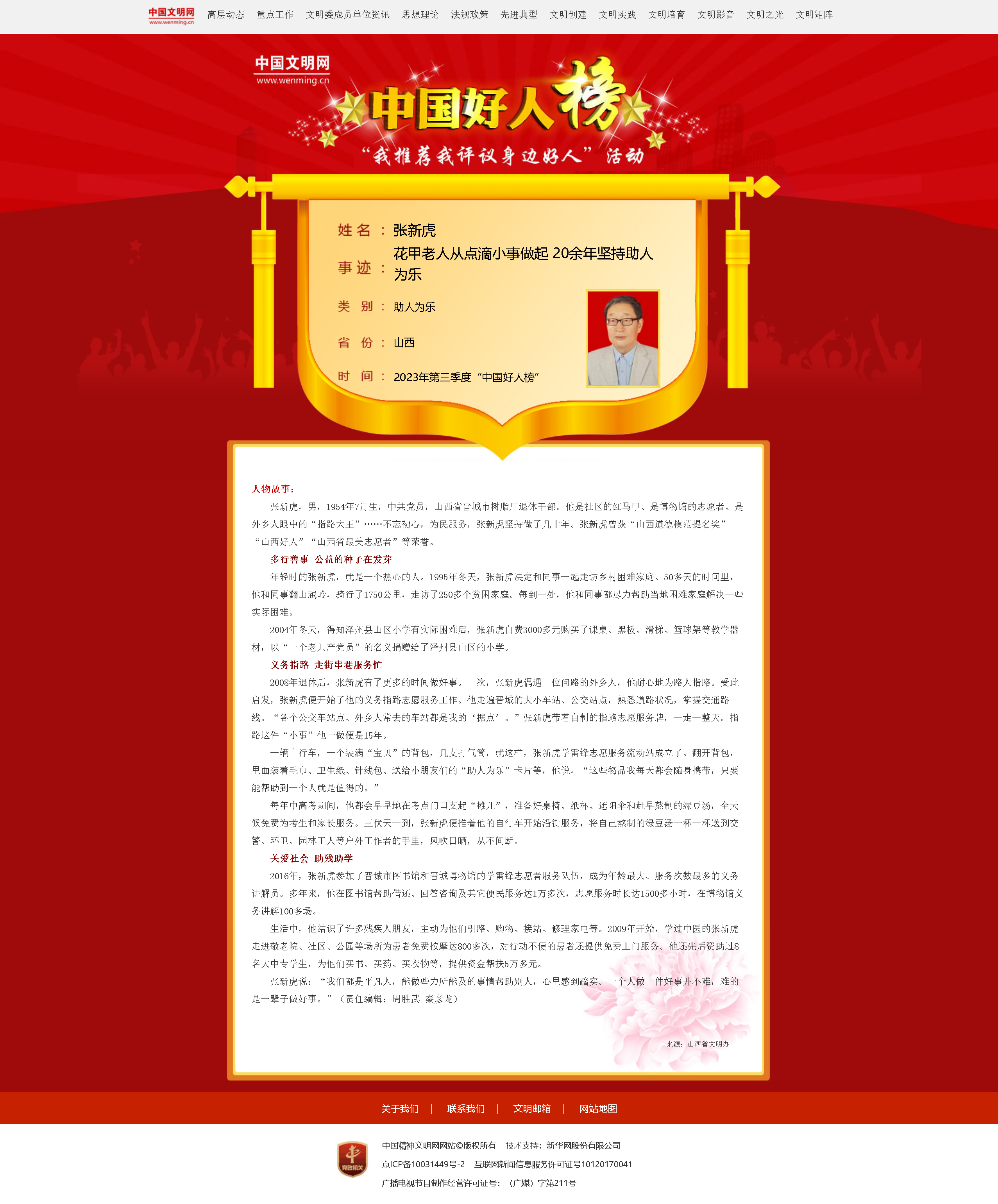 自2008年4月起,中央精神文明建設辦公室已連續15年組織開展網上“我推薦我評議身邊好人”活動,定期發布“中國好人榜”,舉辦“全國道德模范與身邊好人現場交流活動”。截至目前,共有近1.7萬人(組)入選“中國好人榜”,參與互動人次超過100億,在全社會營造了學習中國好人、爭當時代新人的濃厚氛圍。