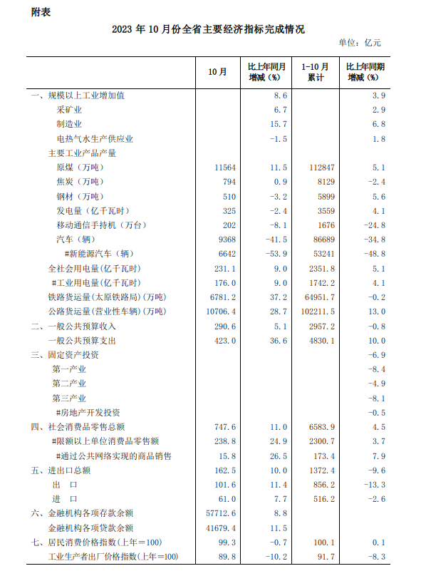 能源保供扎實推進。全省持續加大生產力度,實現了煤、氣、電持續安全穩定供應。全省規上原煤產量112846.5萬噸,增長5.1%;規上非常規天然氣產量增長9.4%;發電量增長4.1%,其中外送電量增長8.4%。