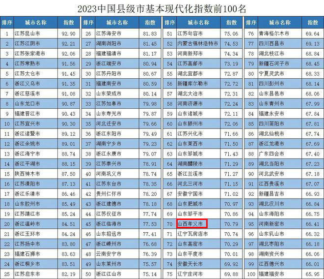 《報(bào)告》顯示,我國城市基本現(xiàn)代化進(jìn)程穩(wěn)步推進(jìn)。中國地級市基本現(xiàn)代化指數(shù)前100名指數(shù)平均為75.34,較去年增加1.17;廣東深圳市基本現(xiàn)代化指數(shù)達(dá)93.32,居全國地級市首位。中國縣級市基本現(xiàn)代化指數(shù)前100名指數(shù)平均為76.56,較去年增加1.48;江蘇昆山市基本現(xiàn)代化指數(shù)達(dá)到92.90,居全國縣級市首位。