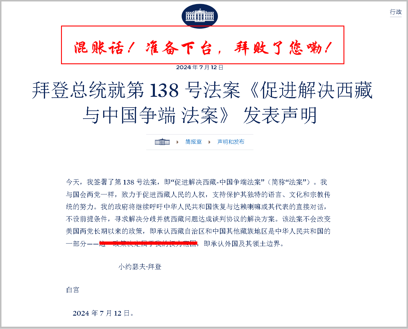 今天,拜登又上演了一幕丑劇,在下臺前翻箱底找出來個“西藏法案”,企圖擾亂國際視線,緩解美國選民包括民主黨在內(nèi)呼吁其退選形成的巨大精神壓力,顧左右而言他,拿中國說事,以壯其膽!