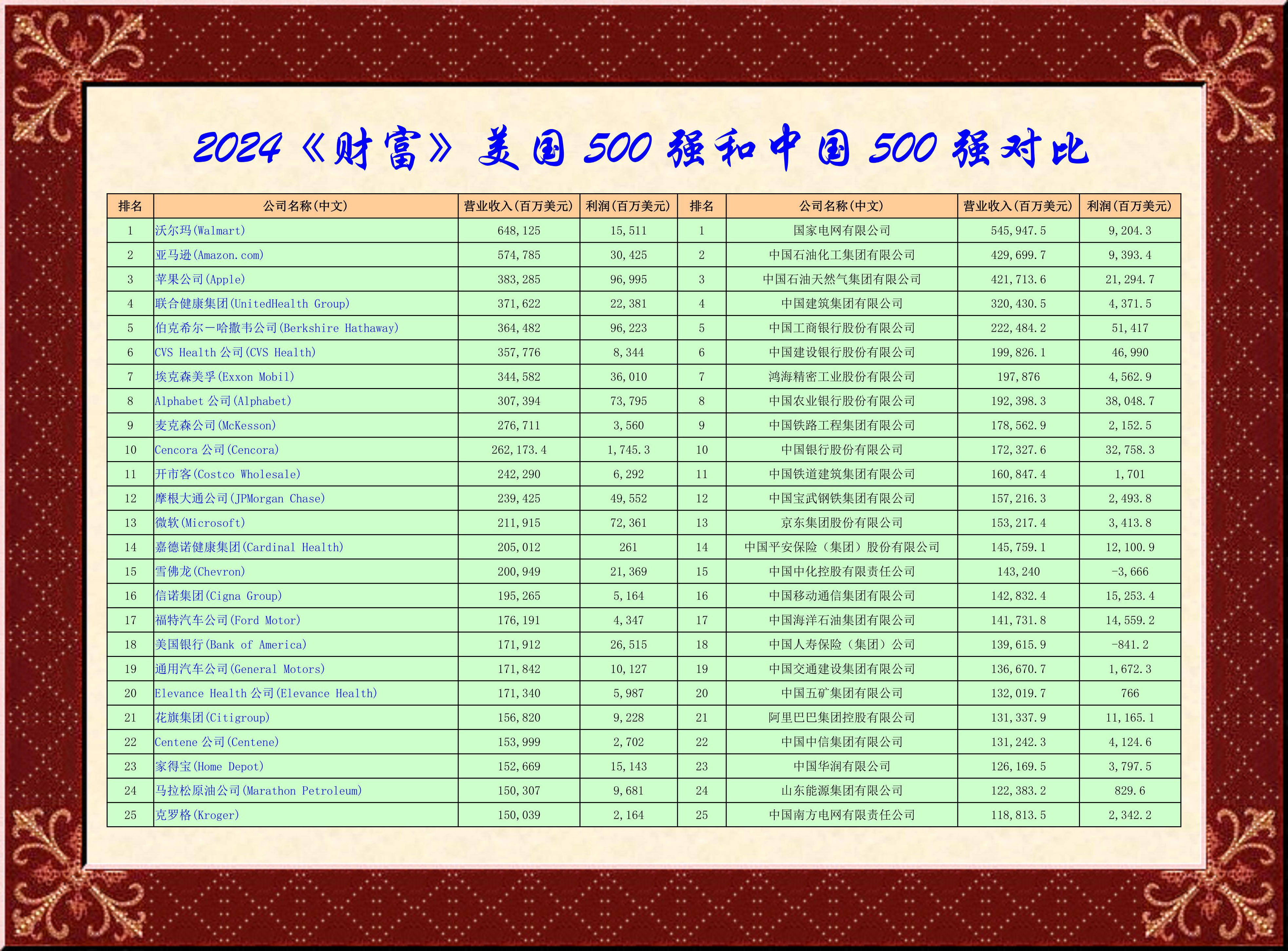 今天,把《財富》美國500強和《財富》中國500強兩個榜單合并,一對一排列,對號入座,公平合理,應無異意!