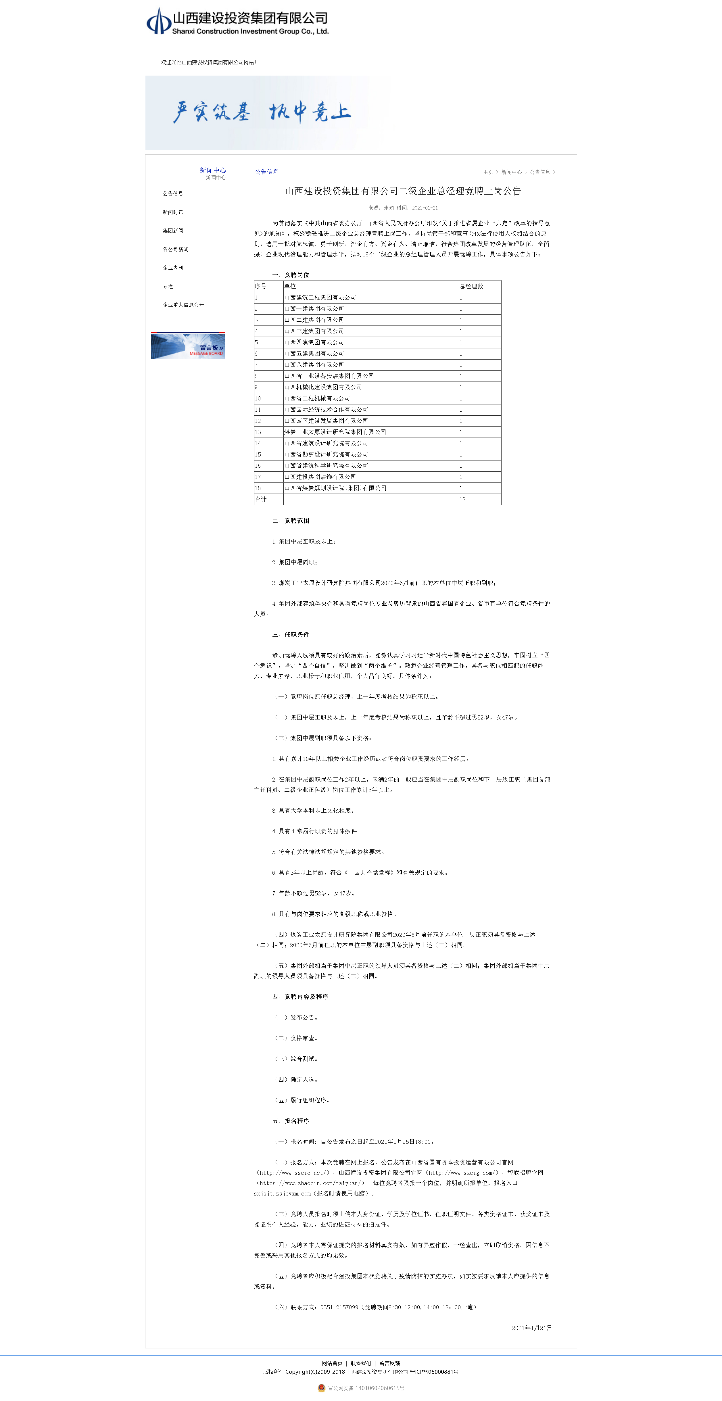 2021年1月22日,山西省人民政府網(wǎng)站、山西省國(guó)有資本運(yùn)營(yíng)有限公司網(wǎng)站、山西建設(shè)投資集團(tuán)有限公司網(wǎng)站,同時(shí)發(fā)布了《山西建設(shè)投資集團(tuán)有限公司二級(jí)企業(yè)總經(jīng)理競(jìng)聘上崗公告》的公告。