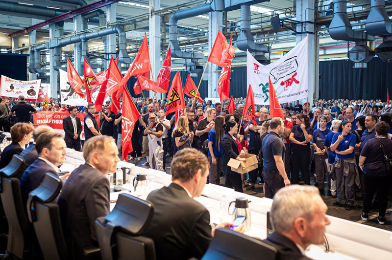 當(dāng)?shù)貢r間9月4日,首次傳出將關(guān)閉本土工廠消息后,大眾汽車在總部舉行員工大會,工人們手舉標(biāo)語抗議。 路透社
