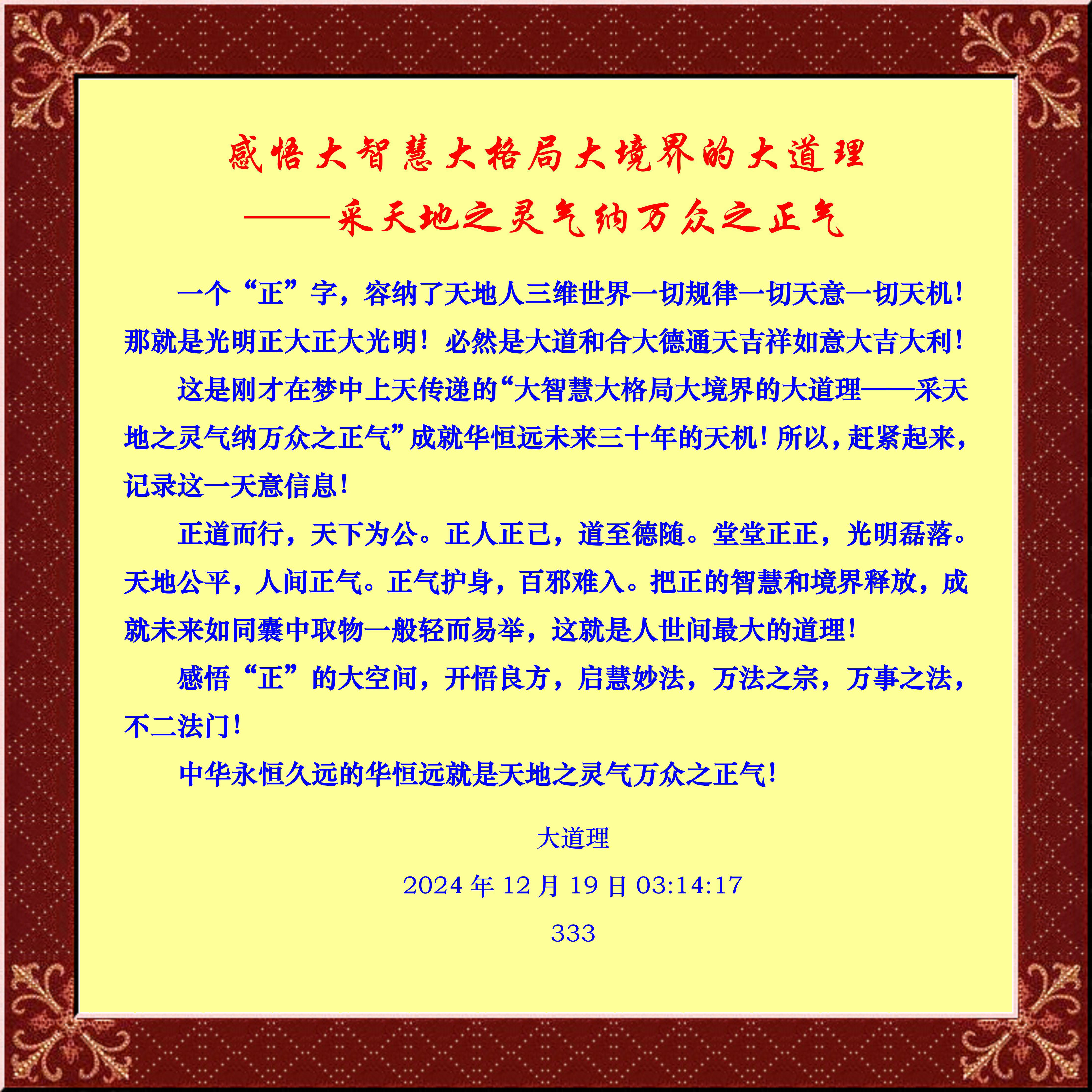 一個“正”字,容納了天地人三維世界一切規律一切天意一切天機!那就是光明正大正大光明!必然是大道和合大德通天的吉祥如意大吉大利!