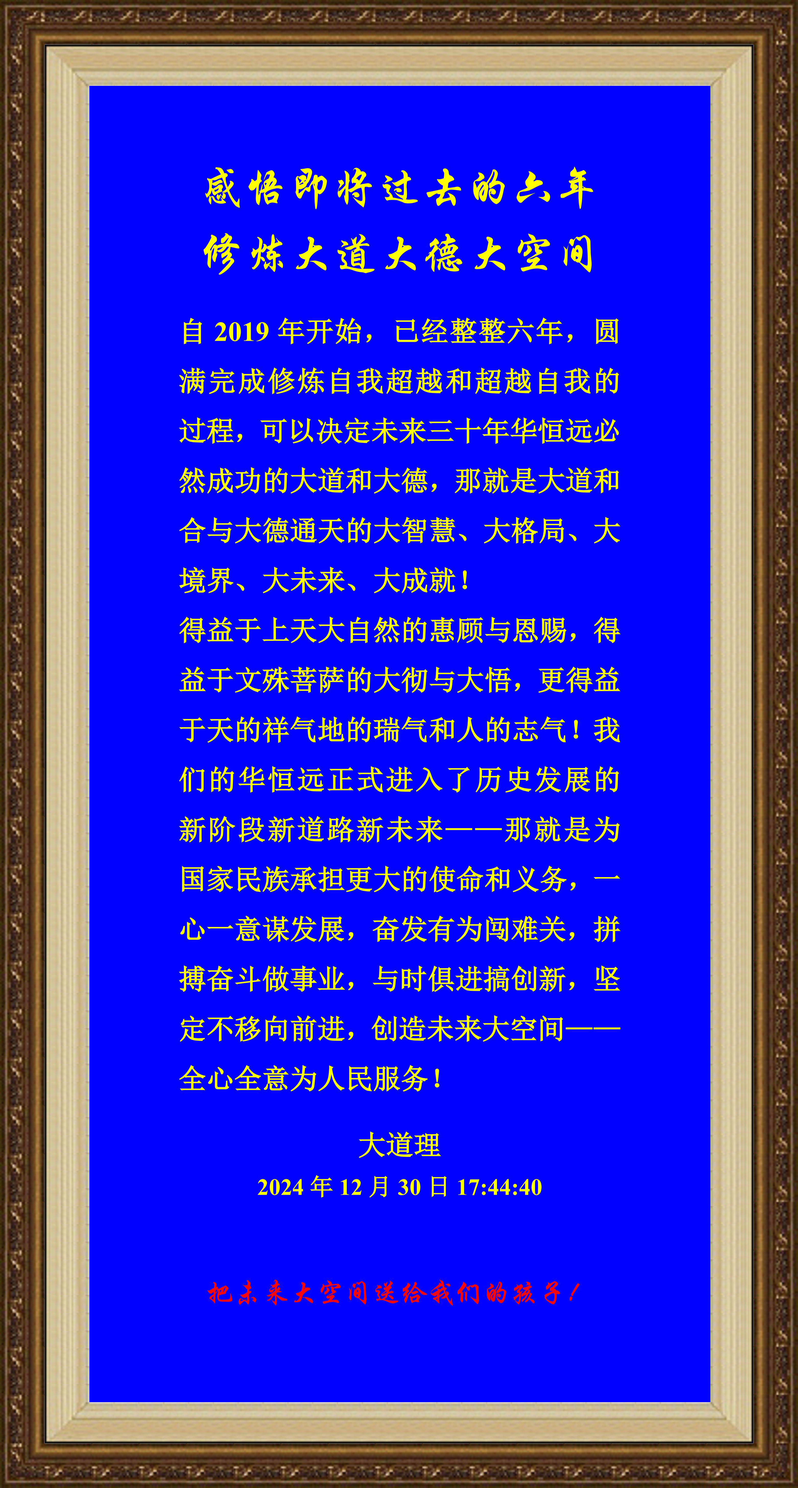 自2019年開始,已經整整六年,圓滿完成修煉自我超越和超越自我的過程,可以決定未來三十年華恒遠必然成功的大道和大德,那就是大道和合與大德通天的大智慧、大格局、大境界、大未來、大成就!