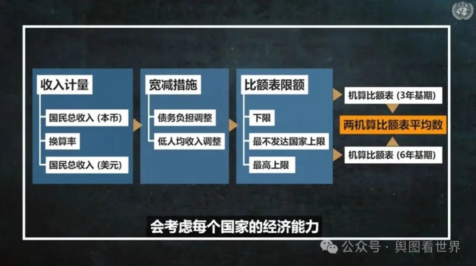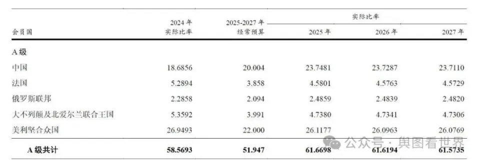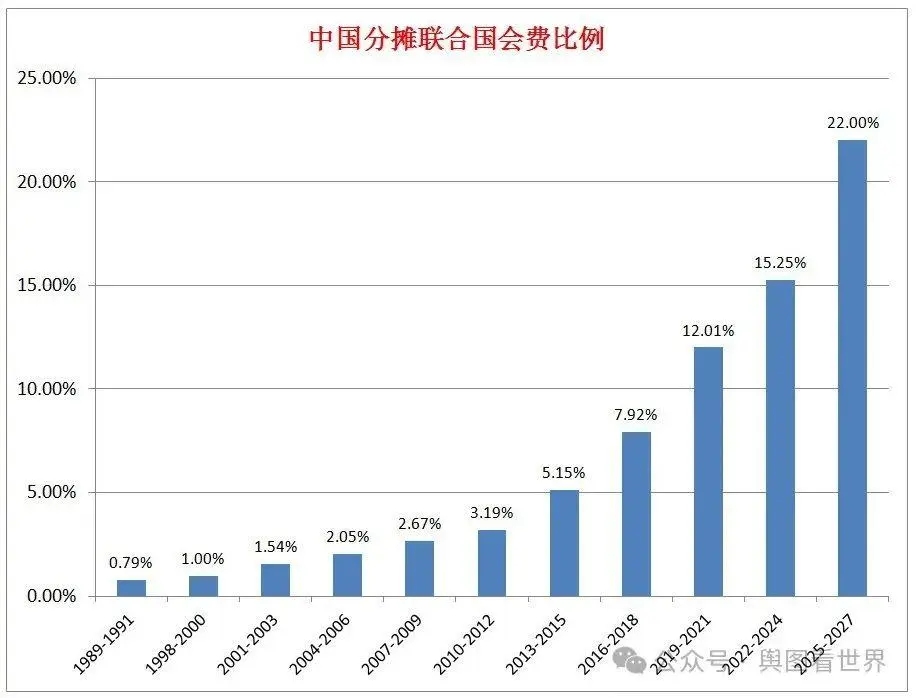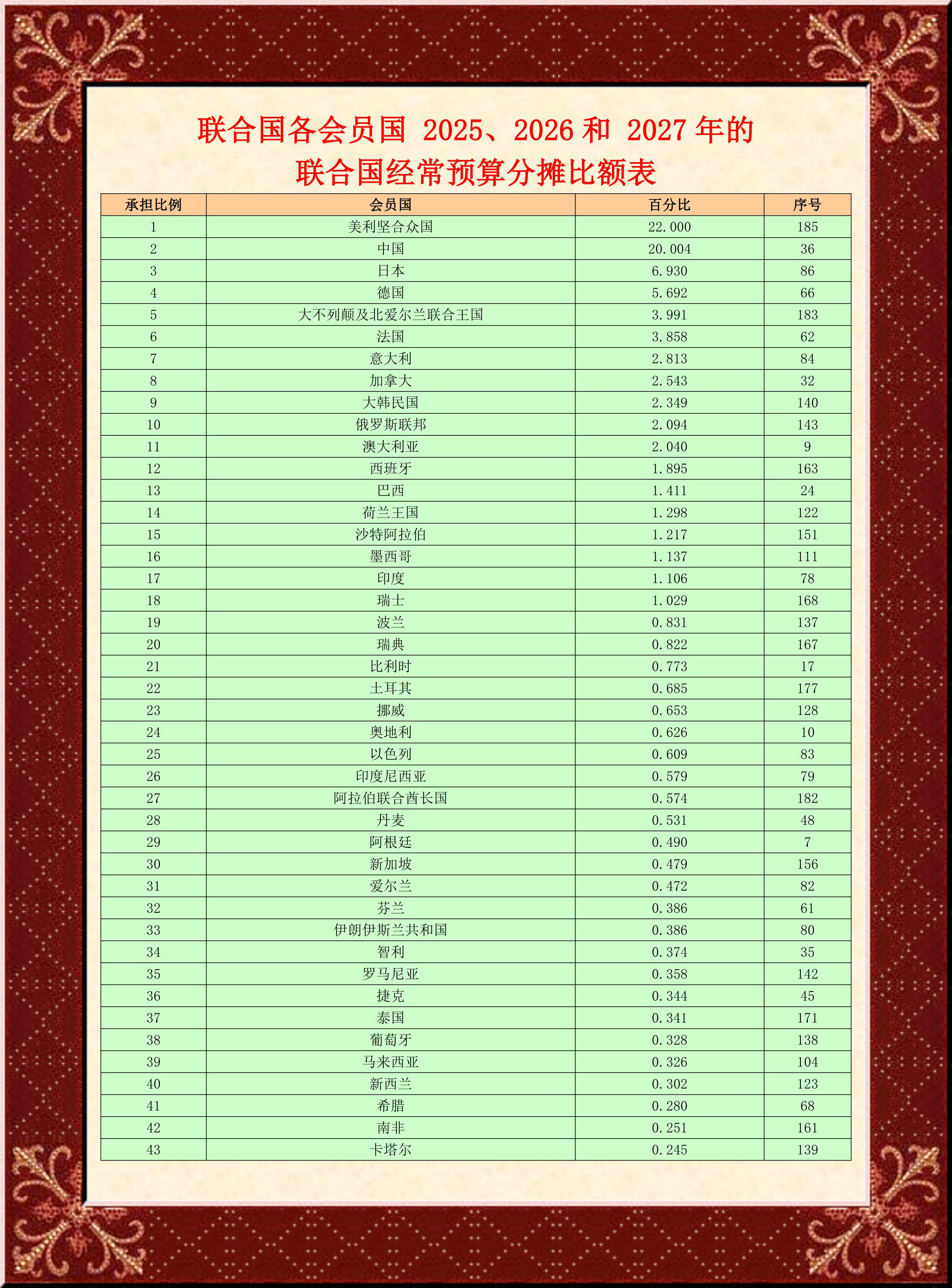2022-2024年,中國的分攤比為15.254%,每年依次繳納4.76億美元、5.18億美元、5.48億美元,合計繳納15.42億美元。中國因為強勁的經濟表現與影響力,占比由目前的15.254%增加4.75%,達到20.004%。這也是中國占比首超20%,直逼美國的22%。未來三年,即使每年的會費均為37.17億美元,那么中國合計需繳納22.30億美元。換言之,2025-2027年中國至少要多繳納6.88億美元,折合人民幣約50.21億。需要注意的是,聯合國的常規預算每年都有小幅增長,因此中國的實際繳納金額可能會更高。