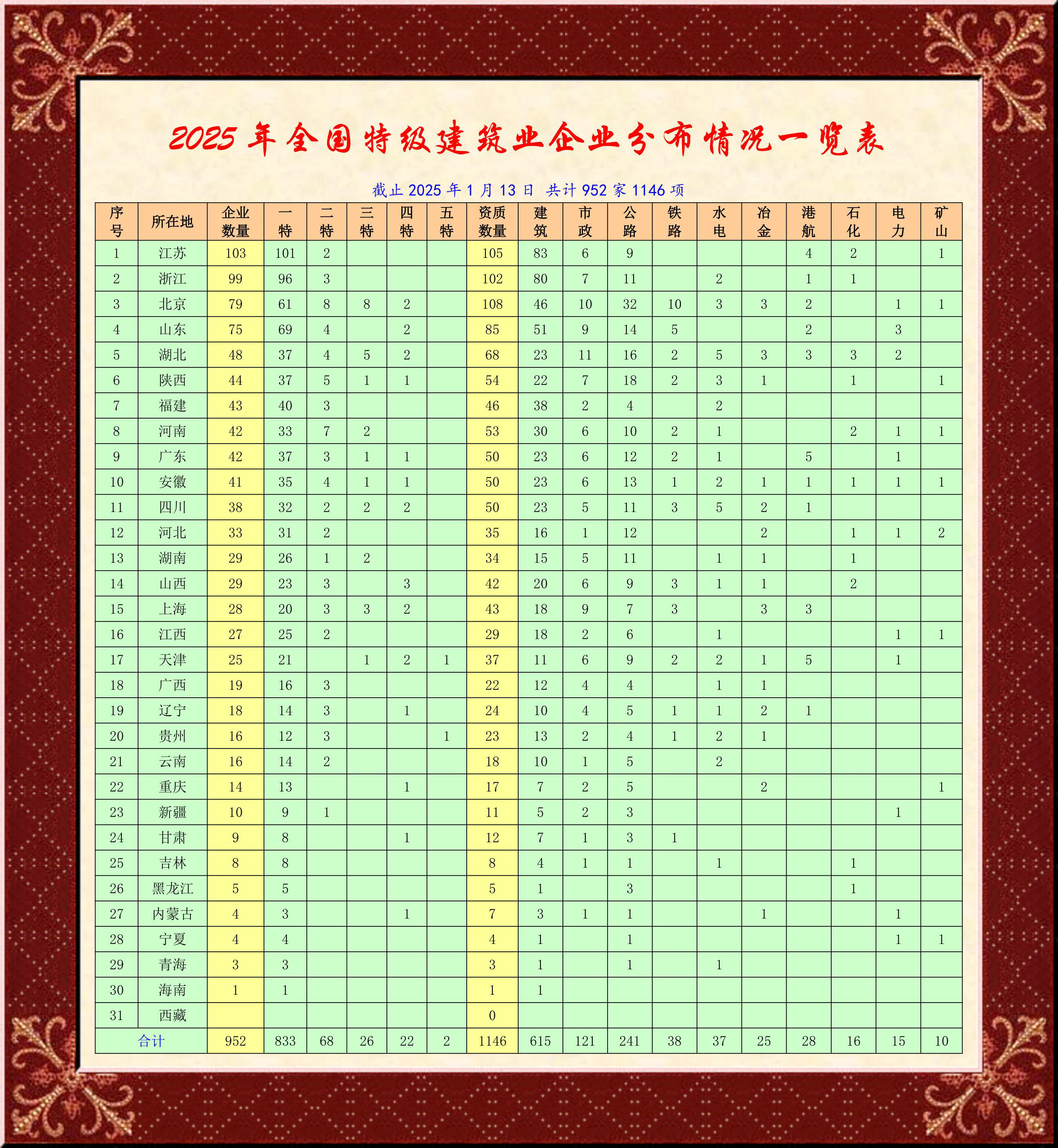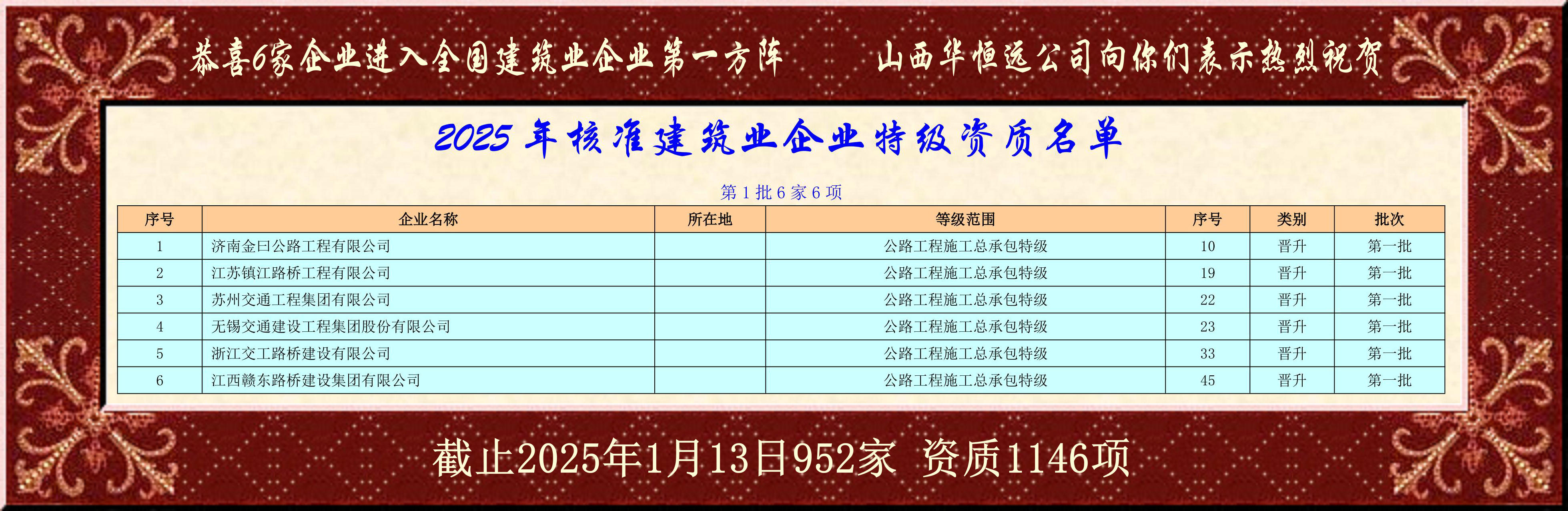 在2025年新春佳節即將到來之際,今天住建部公告了今年核準第一批建筑業企業資質名單,其中6家企業晉升公路工程總承包特級資質。江蘇3家、山東、浙江、江西各一家。至此全國特級資質企業952家,擁有資質1146項。
