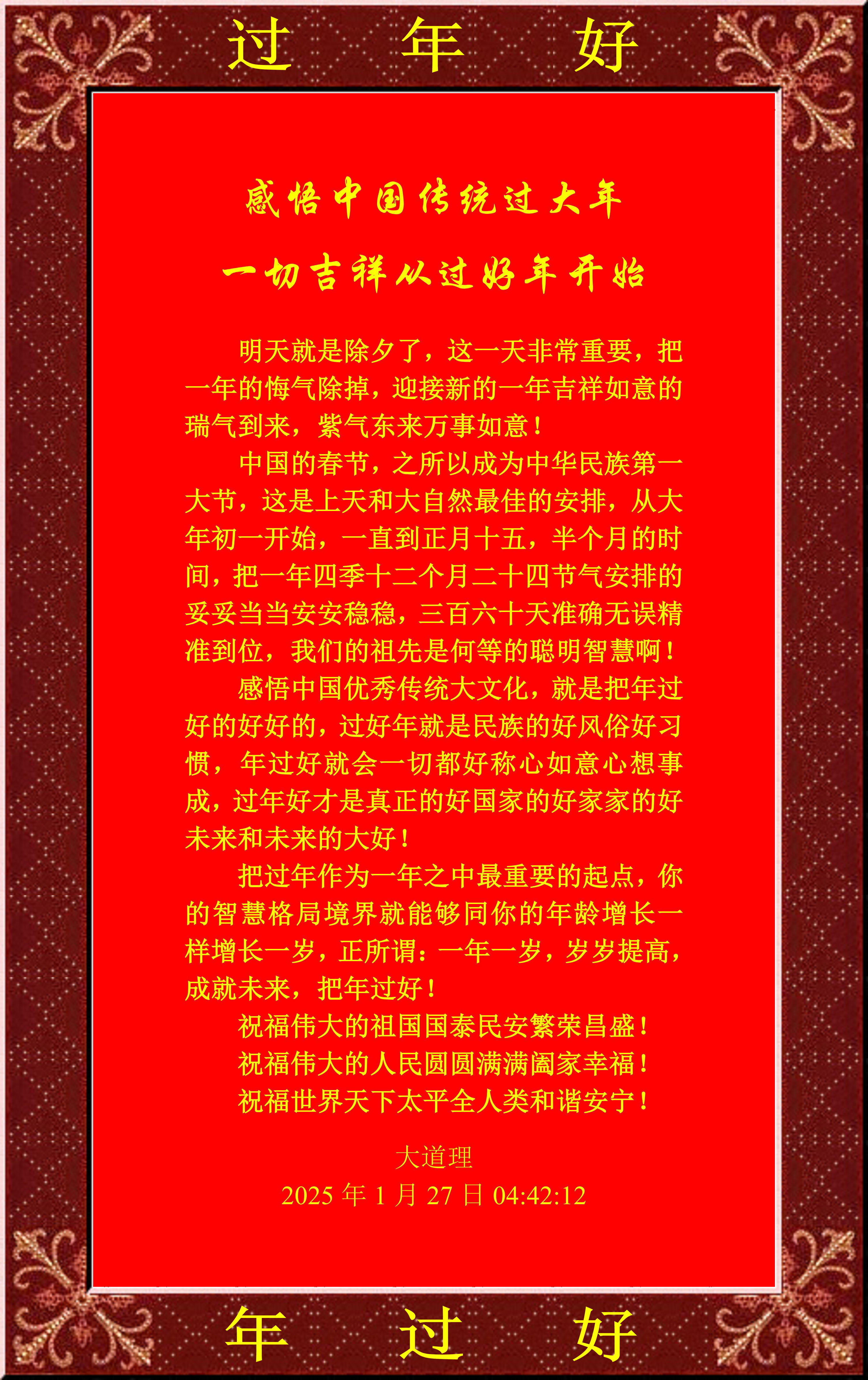 感悟中國優秀傳統大文化,就是把年過好的好好的,過好年就是民族的好風俗好習慣,年過好就會一切都好稱心如意心想事成,過年好才是真正的好國家的好家家的好未來和未來的大好!