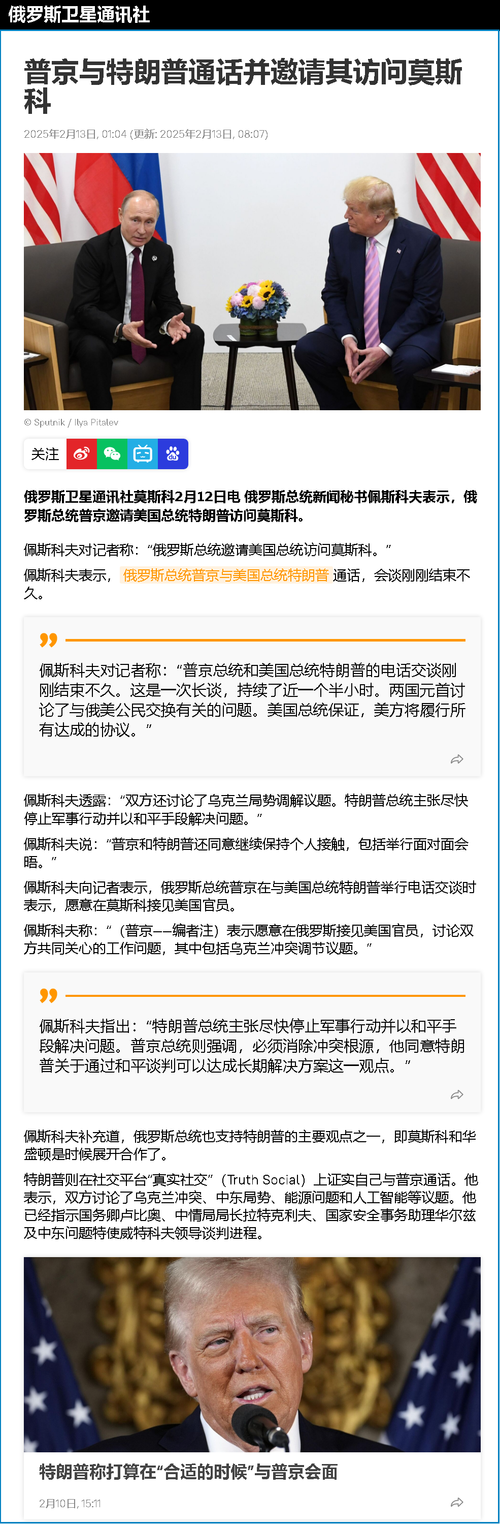 俄總統新聞秘書佩斯科夫當天說,俄美兩國元首在通話中同意組織兩人的會晤,普京邀請特朗普訪問莫斯科。特朗普在社交媒體上表示,美俄雙方同意就結束俄烏沖突進行“緊密合作”,并派遣各自團隊“立即開始談判”。