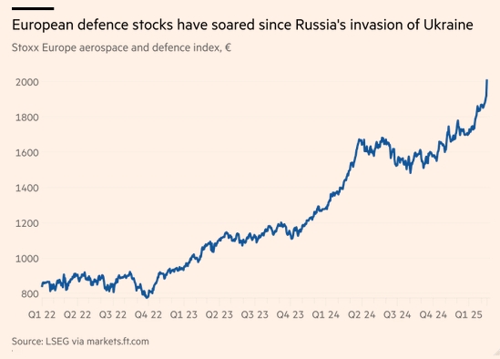 自2022年年初以來,歐洲Stoxx 600指數航空航天與國防板塊一路上漲 《金融時報》制圖