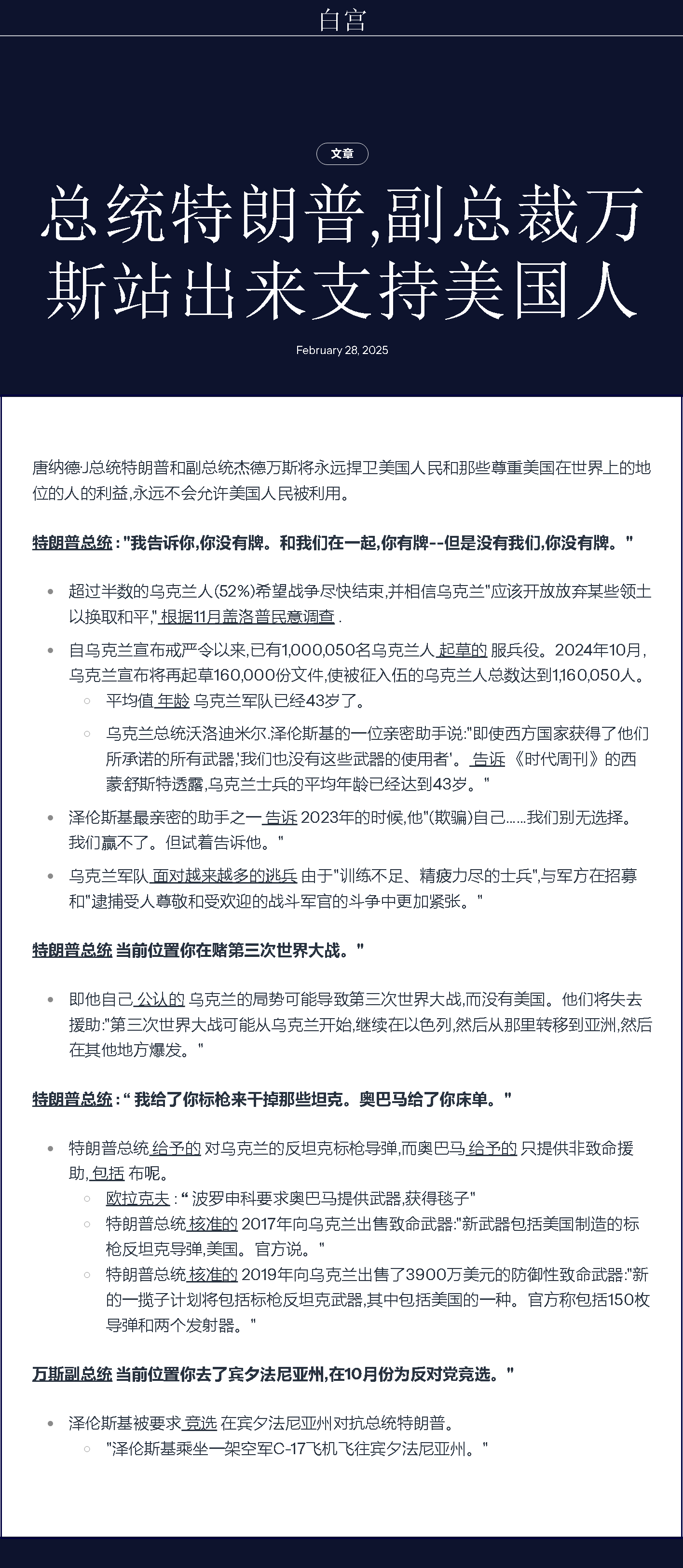 澤連斯基在離開白宮后在社交媒體上發文,對美國給予烏克蘭的支持向特朗普和美國人民表達感謝,但他同時強調:“烏克蘭需要正義和持久的和平,我們正為此努力。”