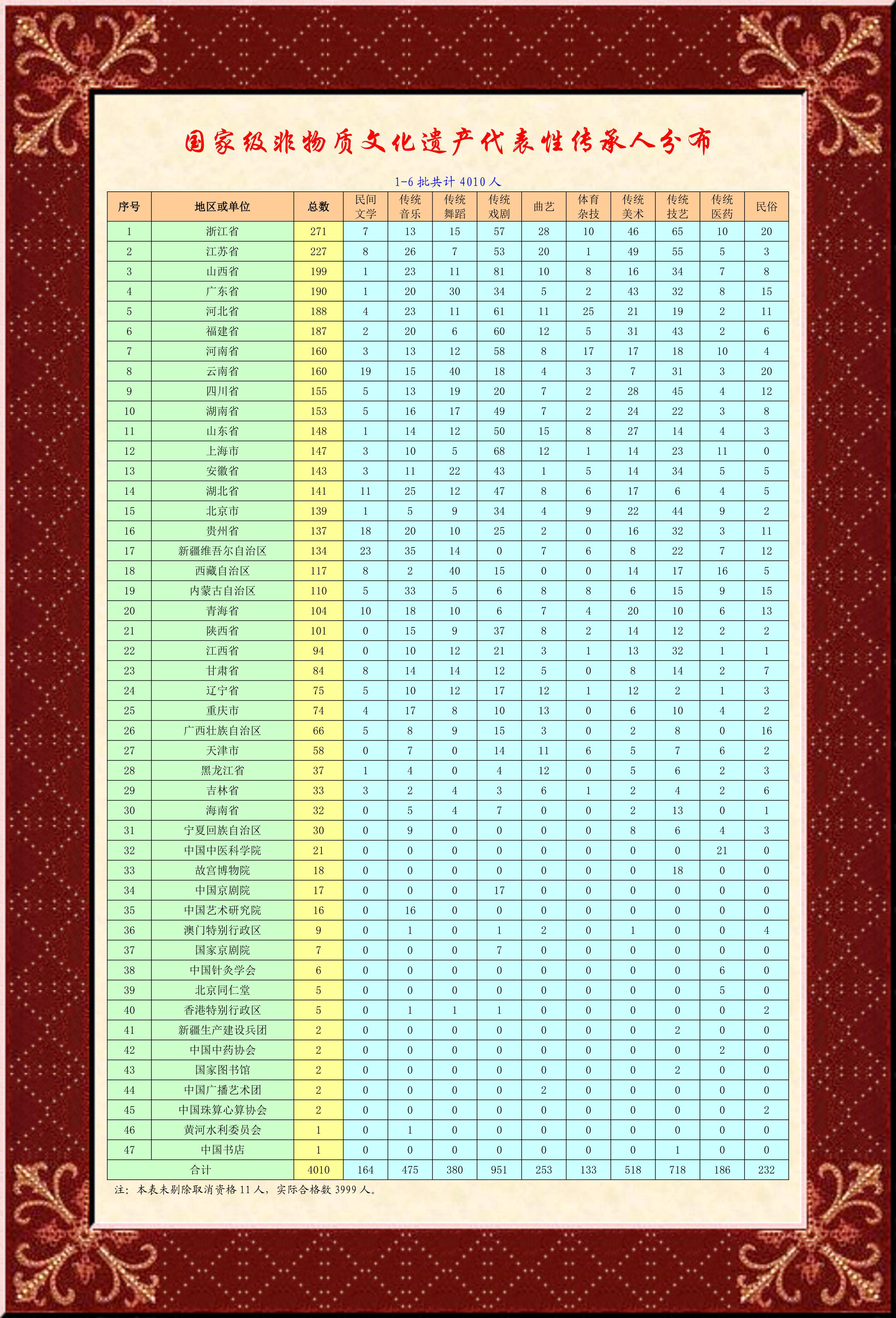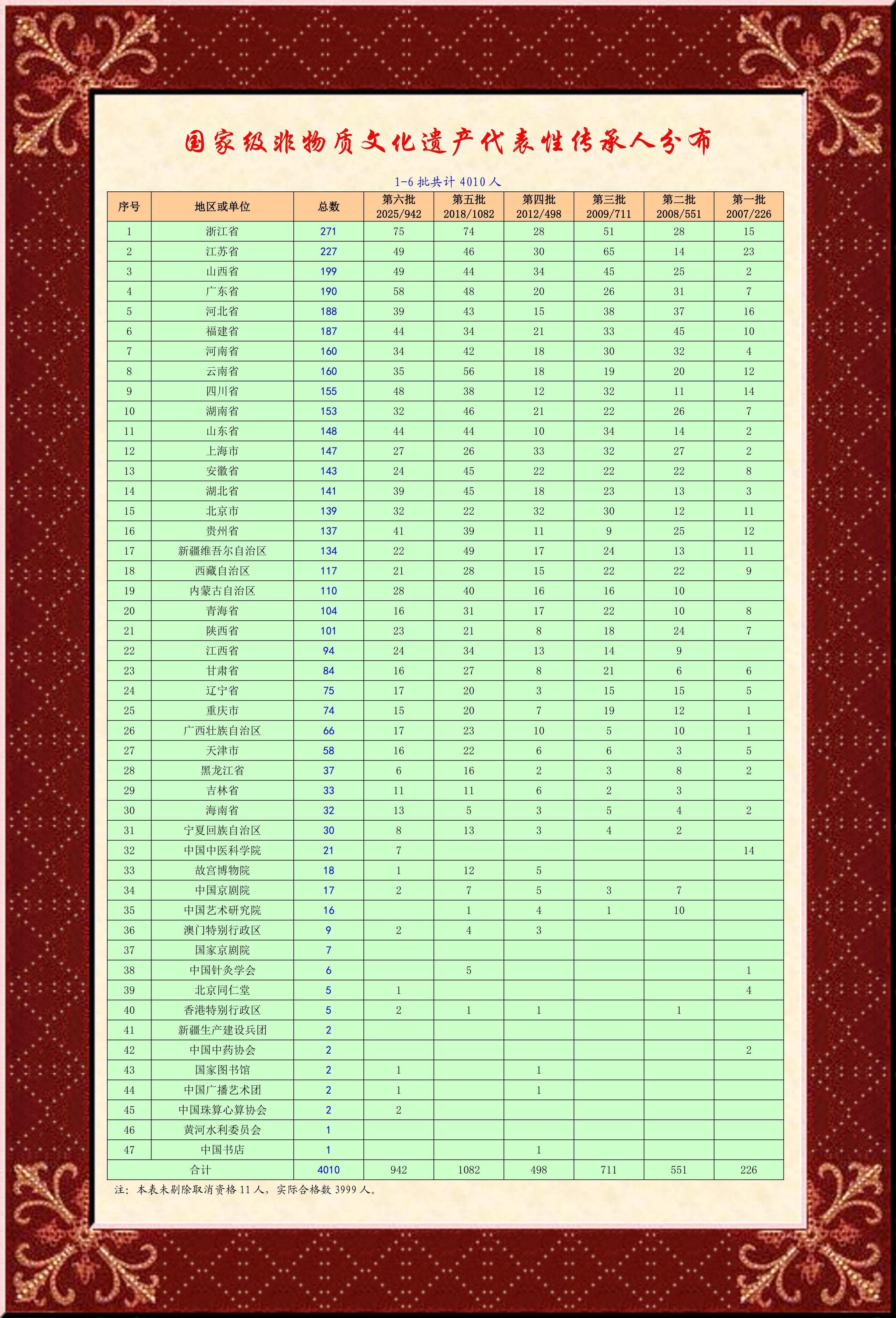 2007年第一批226個/人、2008年第二批551個/人、2009年第三批711個/人、2012年第四批498個/人、2018年第五批1082個/人,2025年第六批942個/人,共計4010人