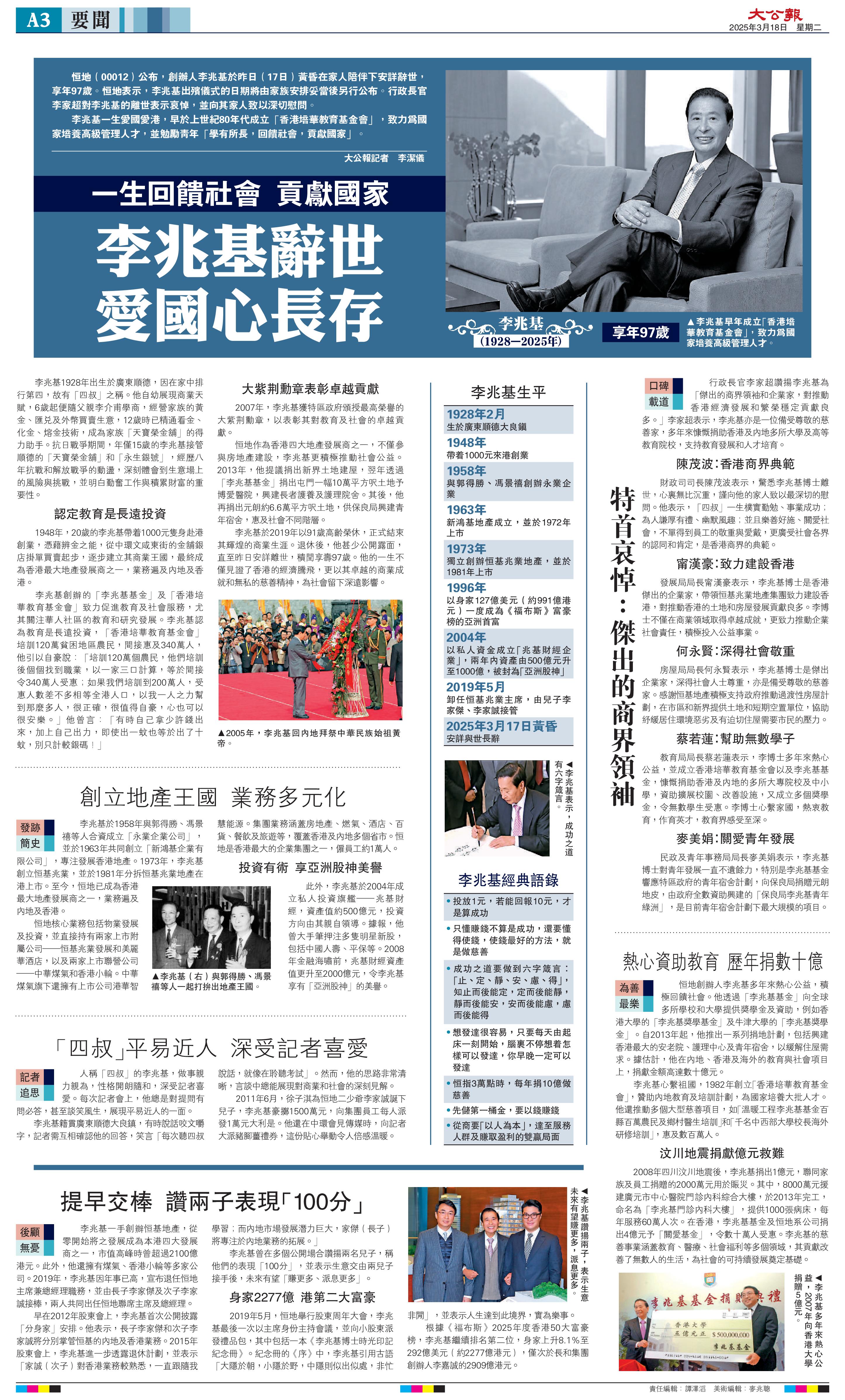 李兆基於2019年以91歲高齡榮休,正式結束其輝煌的商業生涯。退休後,他甚少公開露面,直至昨日安詳離世,積閏享壽97歲。他的一生不僅見證了香港的經濟騰飛,更以其卓越的商業成就和無私的慈善精神,為社會留下深遠影響。