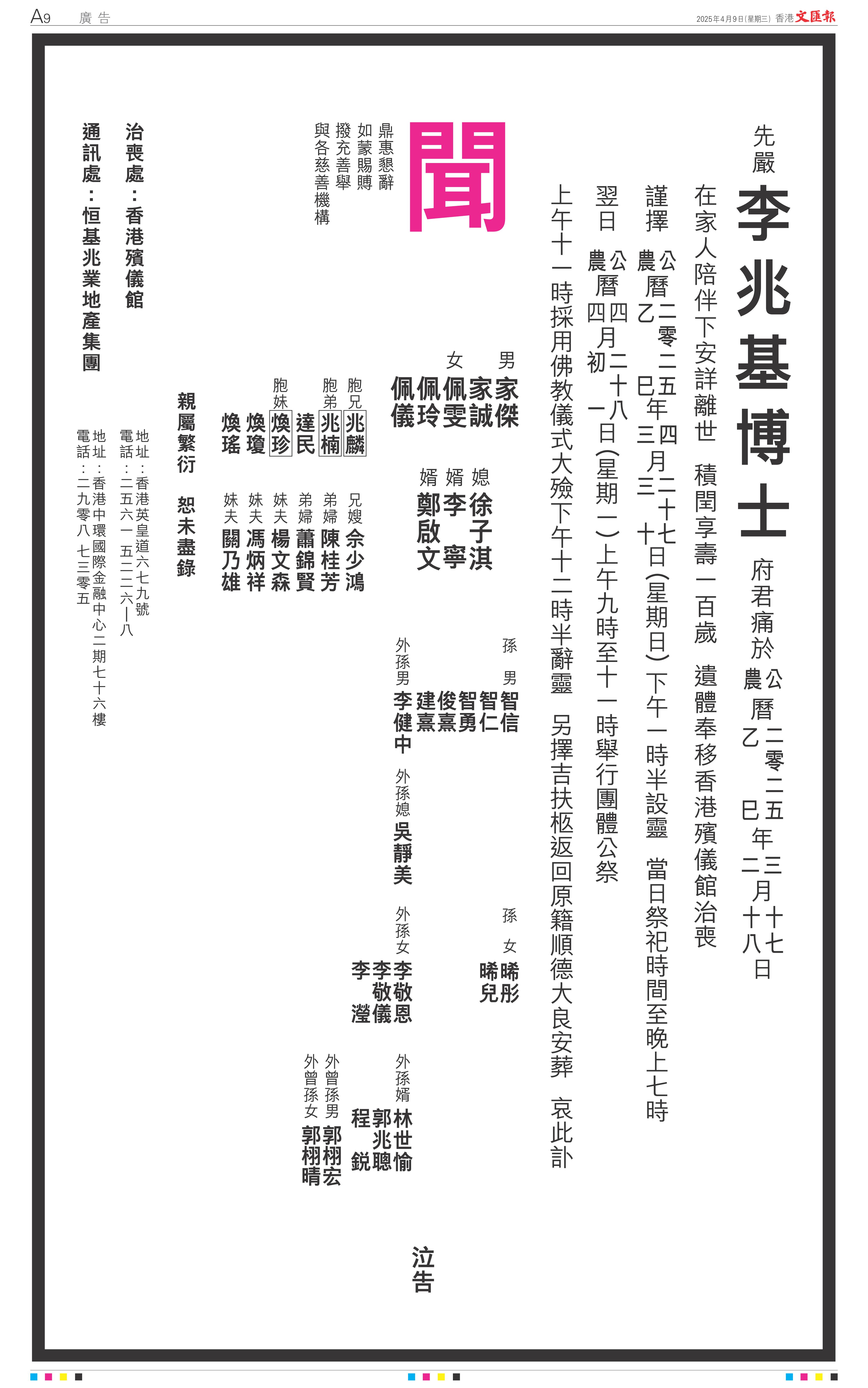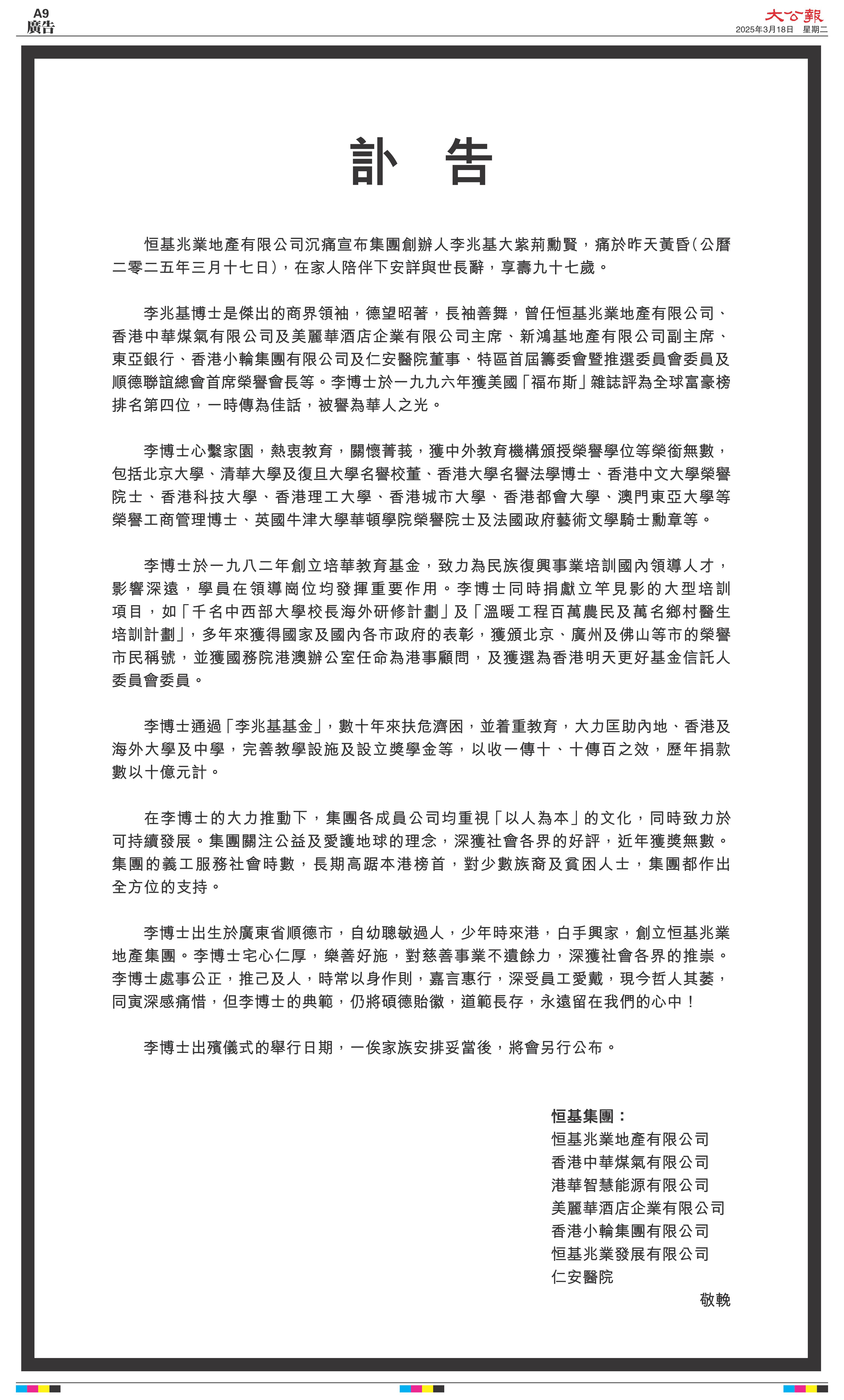 卸任恒基兆業主席,由兒子李家傑、李家誠接管