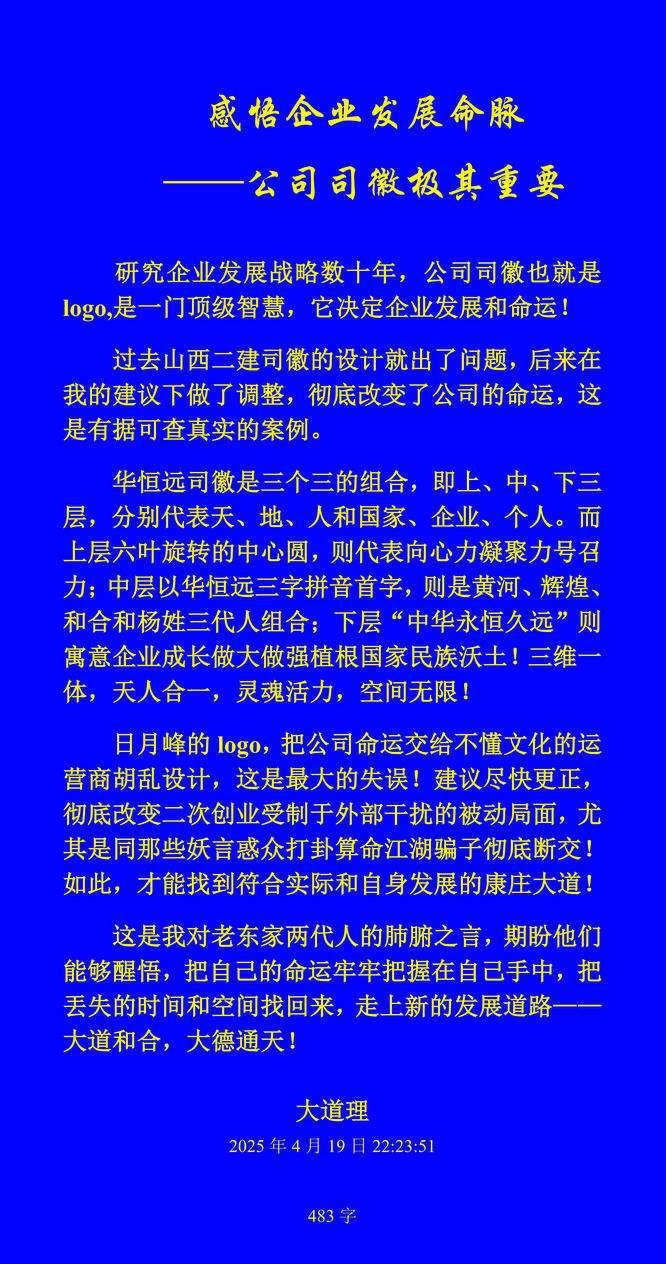 這是我對老東家兩代人的肺腑之言,期盼他們能夠醒悟,把自己的命運牢牢把握在自己手中,把丟失的時間和空間找回來,走上新的發展道路——大道和合,大德通天!