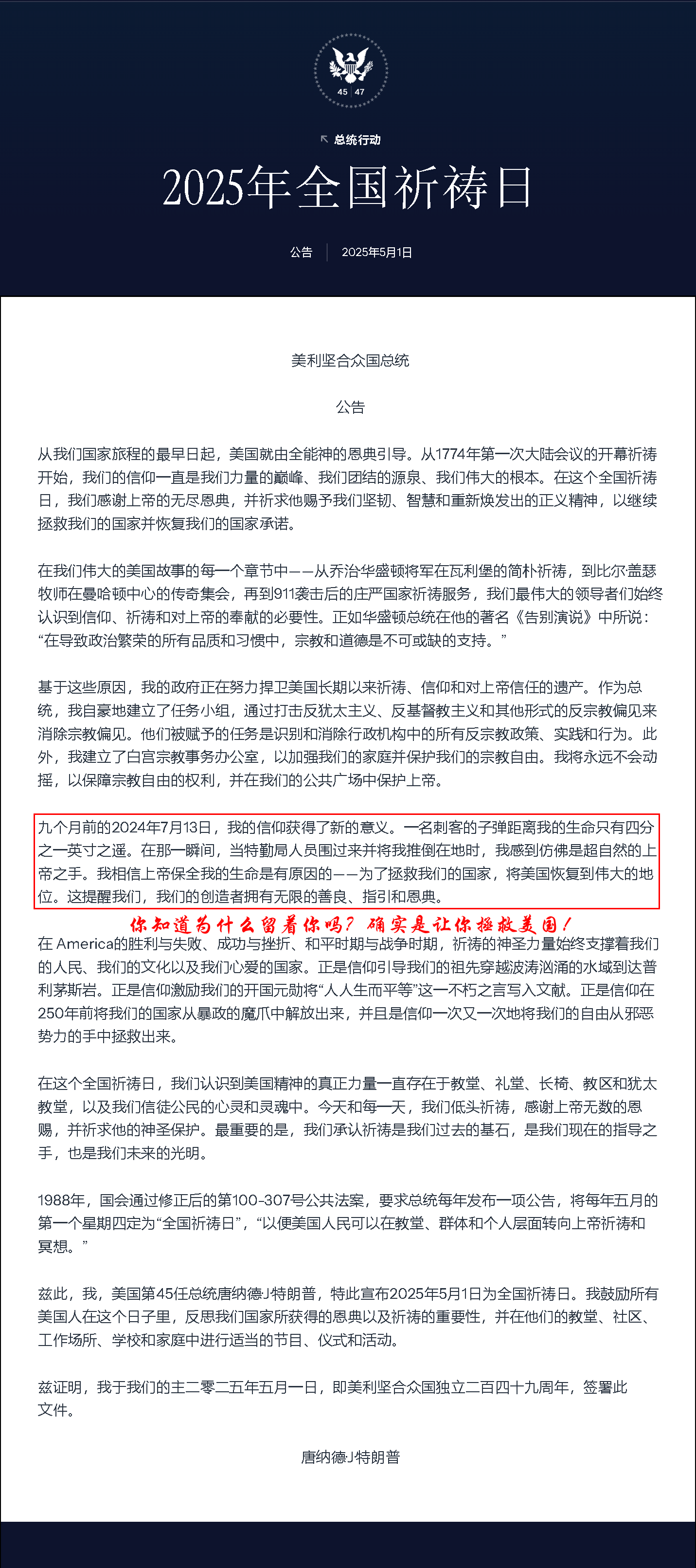茲此,我,美國第45任總統唐納德·J·特朗普,特此宣布2025年5月1日為全國祈禱日。我鼓勵所有美國人在這個日子里,反思我們國家所獲得的恩典以及祈禱的重要性,并在他們的教堂、社區、工作場所、學校和家庭中進行適當的節目、儀式和活動。