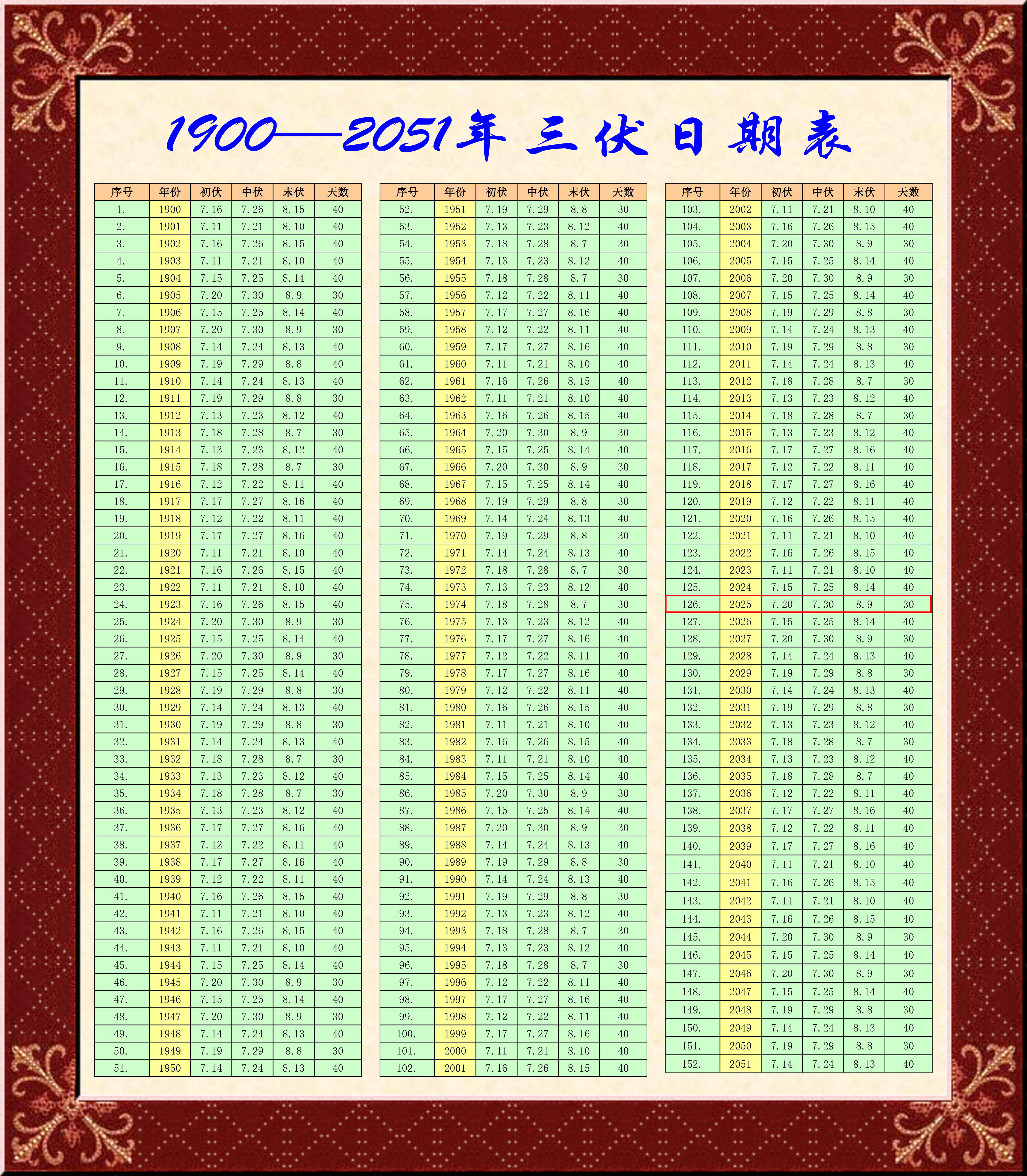 初伏 2025年7月20日-2025年7月29日,共10天;