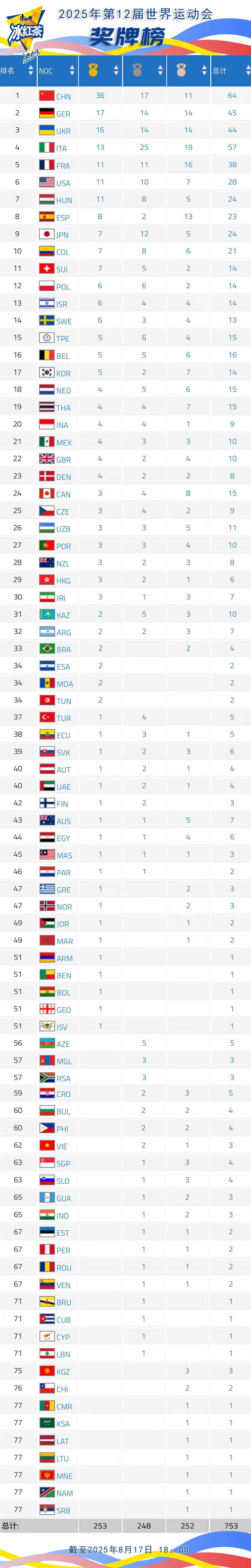第12屆世界運(yùn)動(dòng)會(huì)獎(jiǎng)牌榜