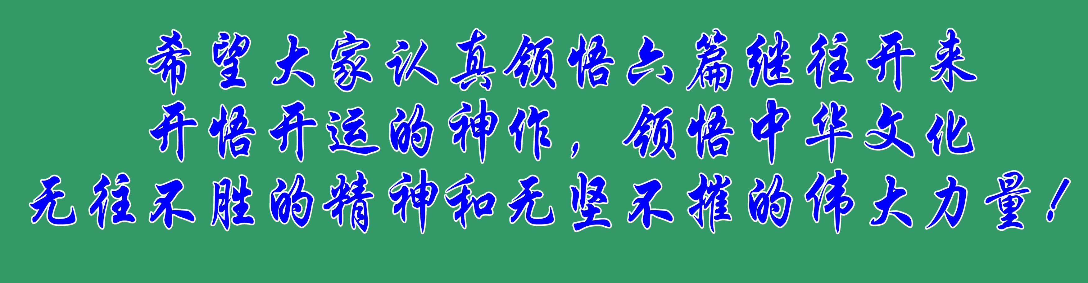 希望大家認(rèn)真領(lǐng)悟六篇繼往開來開悟開運(yùn)的神作,領(lǐng)悟中華文化無往不勝的精神和無堅(jiān)不摧的偉大力量!