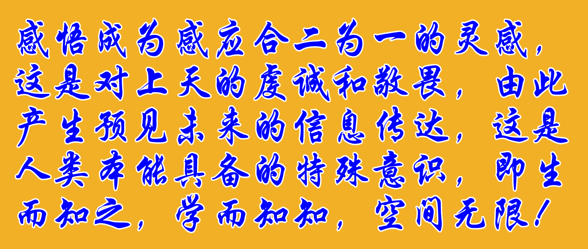 感悟成為感應(yīng)合二為一的靈感,這是對(duì)上天的虔誠(chéng)和敬畏,由此產(chǎn)生預(yù)見未來的信息傳達(dá),這是人類本能具備的特殊意識(shí),即生而知之,學(xué)而知知,空間無限!
