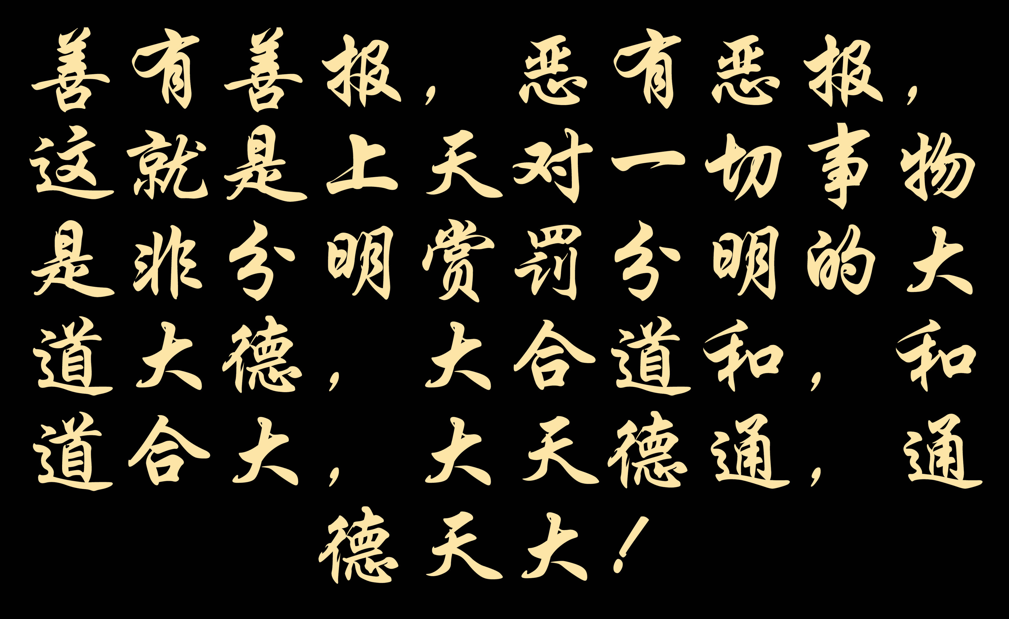 善有善報(bào),惡有惡報(bào),這就是上天對一切事物是非分明賞罰分明的大道大德:大合道和,和道合大,大天德通,通德天大!