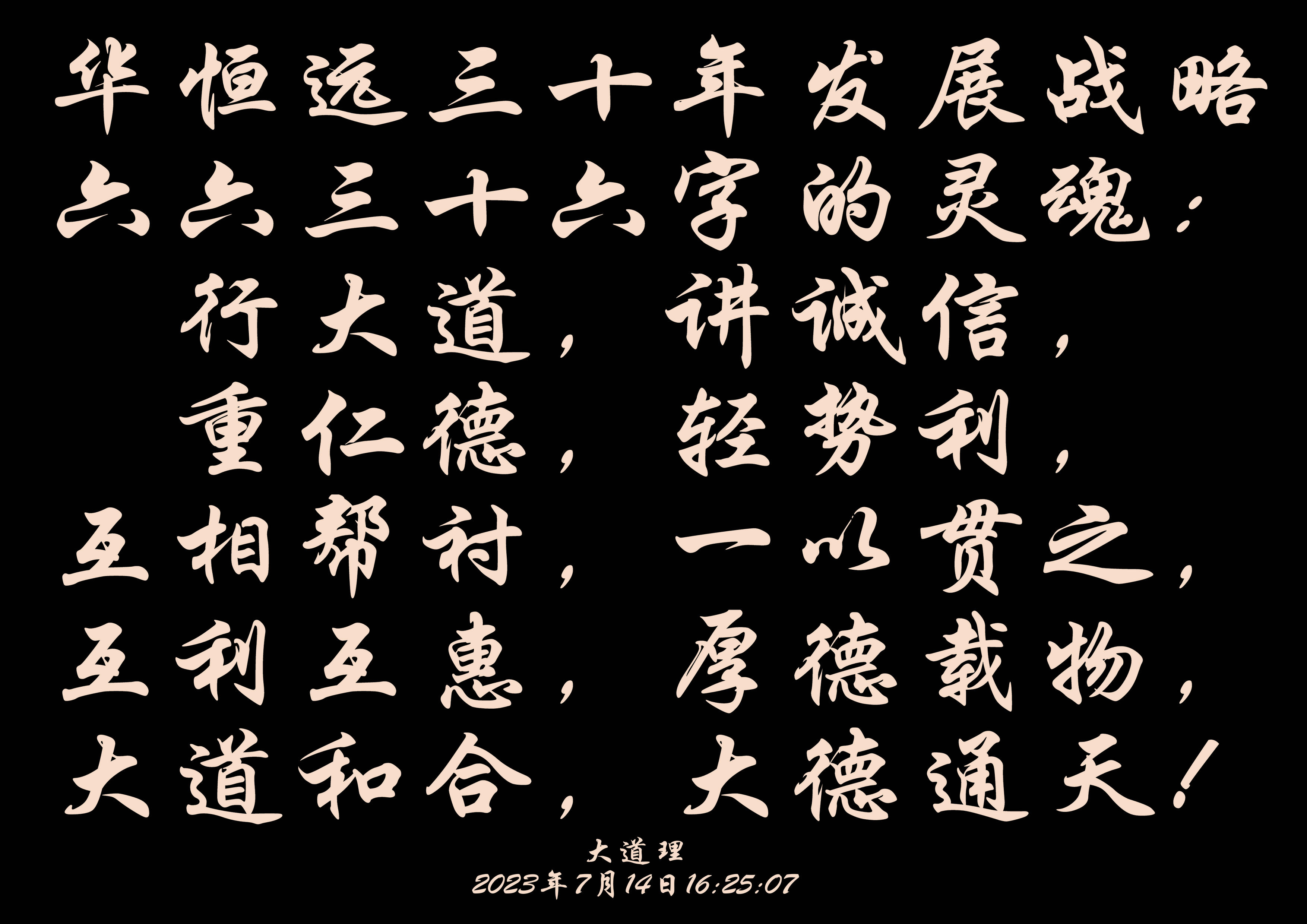 我們制定華恒遠三十年發展戰略規劃,是從著眼當下展望未來的高度,從符合實際的角度,適合自己的深度,知近觀遠,統籌兼顧;既不急功近利,也不急于求成,還不好大喜功,更不鋌而走險,決不畏縮不前,這五個“不”,來衡量和考慮。同時,要堅持一貫:做有準備的事,做有把握的事,做有前途的事,做有利人的事,做有利己的事;這五個“做”,即彰現華恒遠企業文化的追求,又昭示華恒遠企業發展戰略六六三十六字的靈魂:行大道,講誠信,重仁德,輕勢利,互相幫襯,一以貫之,互利互惠,厚德載物,大道和合,大德通天!