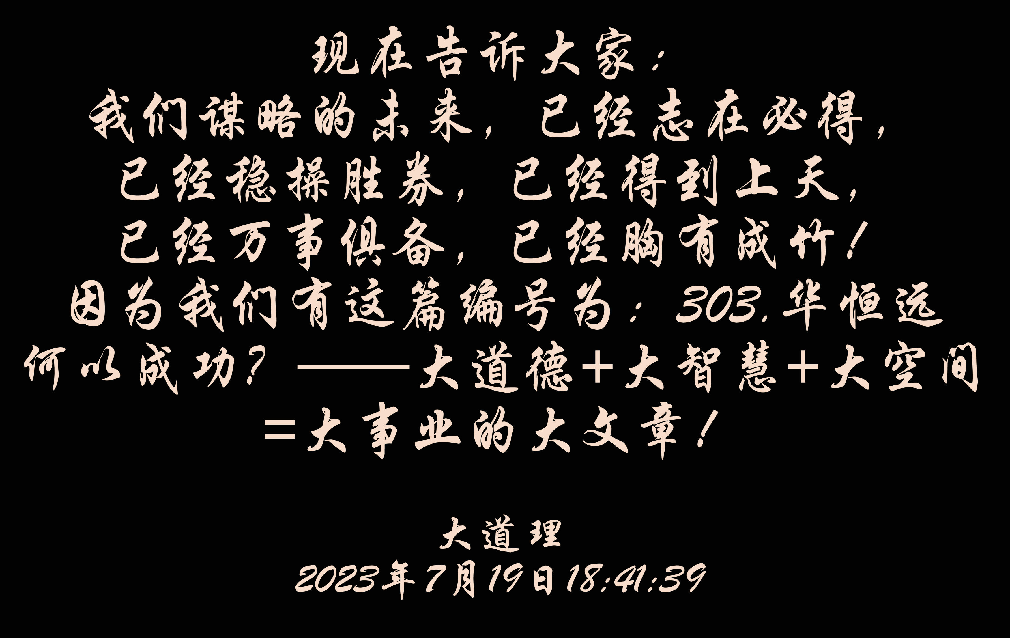 現(xiàn)在告訴大家:我們謀略的未來(lái),已經(jīng)志在必得,已經(jīng)穩(wěn)操勝券,已經(jīng)得到上天,已經(jīng)萬(wàn)事俱備,已經(jīng)胸有成竹!因?yàn)槲覀冇羞@篇編號(hào)為:303.華恒遠(yuǎn)何以成功?——大道德+大智慧+大空間=大事業(yè)的大文章!