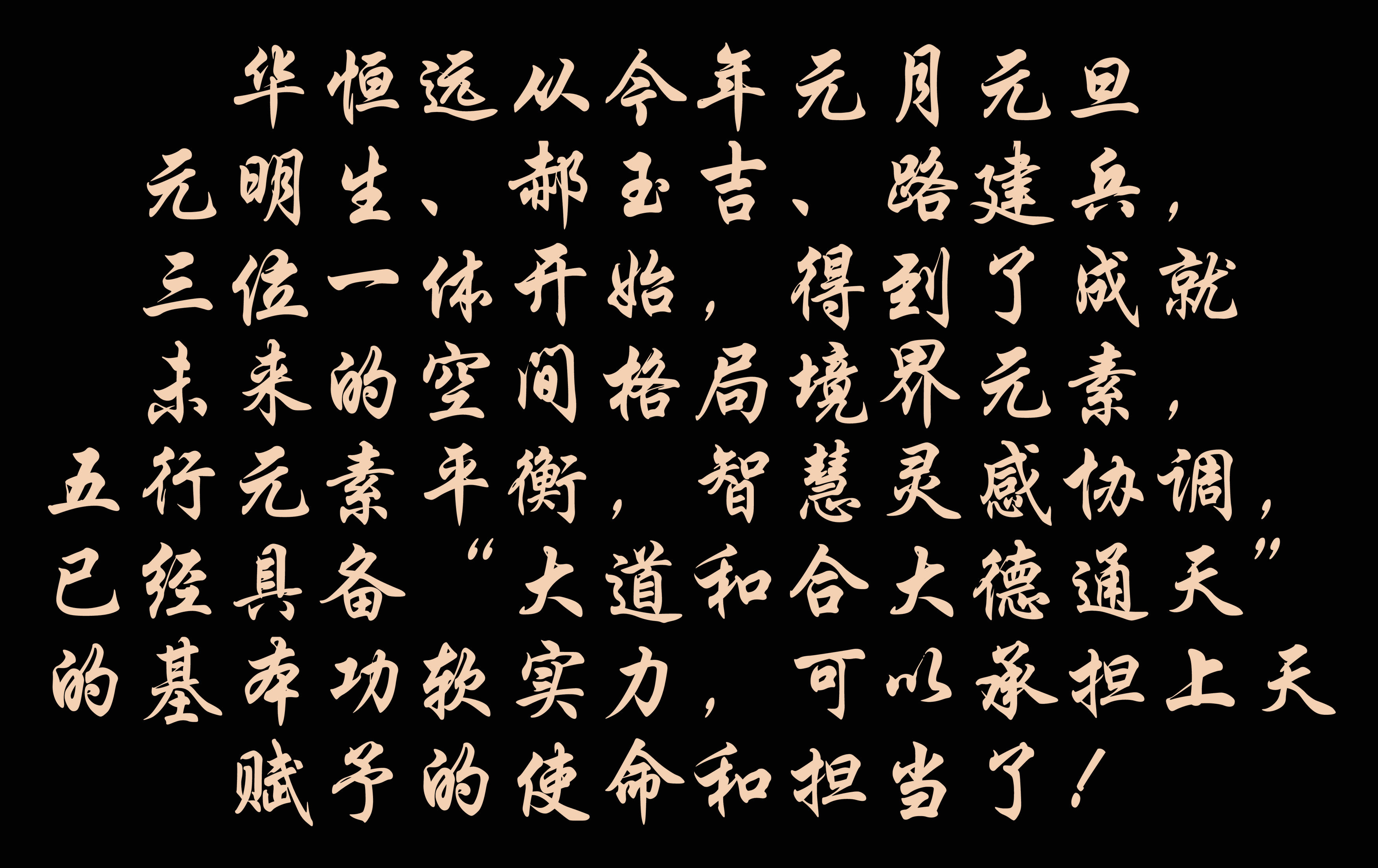 華恒遠從今年元月元旦元明生、郝玉吉、路建兵,三位一體開始,得到了成就未來的空間格局境界元素,五行元素平衡,智慧靈感協調,已經具備“大道和合大德通天”的基本功軟實力,可以承擔上天賦予的使命和擔當了!