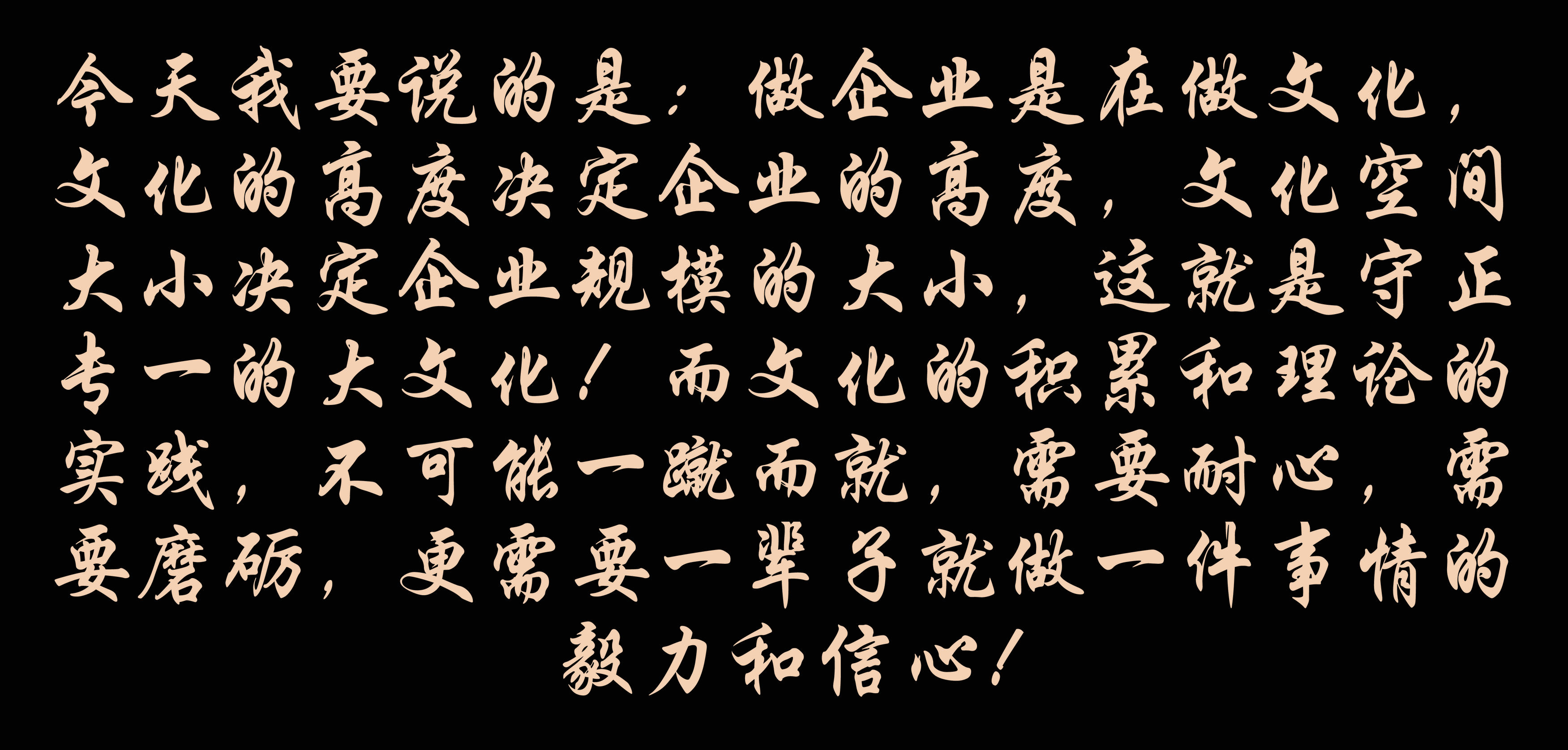 今天我要說的是:做企業是在做文化,文化的高度決定企業的高度,文化空間大小決定企業規模的大小,這就是守正專一的大文化!而文化的積累和理論的實踐,不可能一蹴而就,需要耐心,需要磨礪,更需要一輩子就做一件事情的毅力和信心!