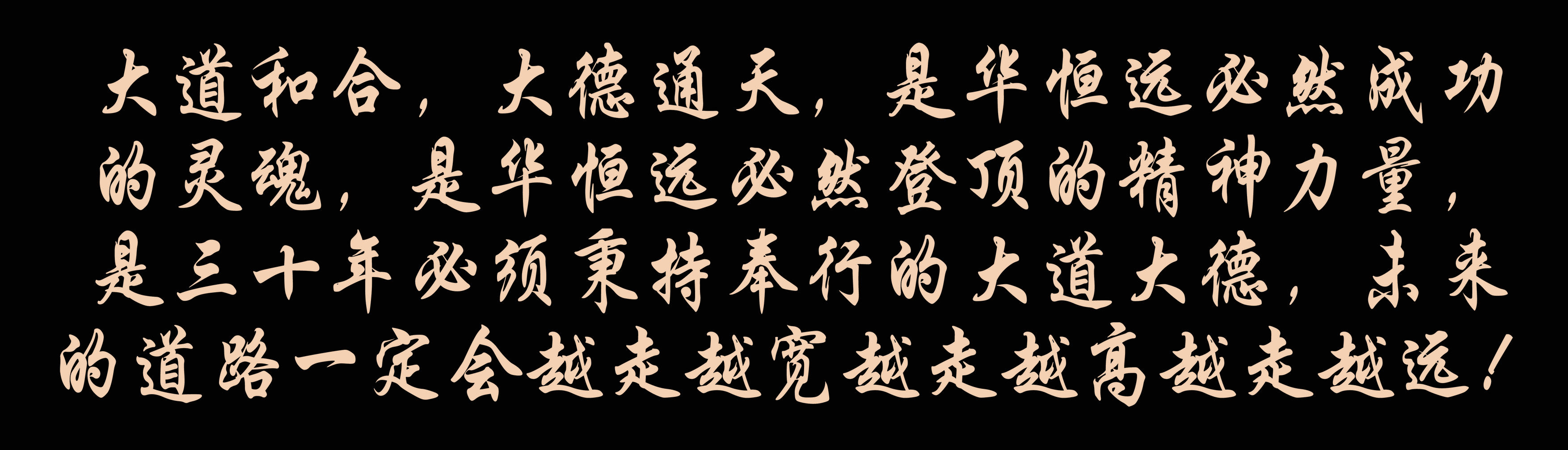 大道和合,大德通天,是華恒遠必然成功的靈魂,是華恒遠必然登頂的精神力量,是三十年必須秉持奉行的大道大德,未來的道路一定會越走越寬越走越高越走越遠!