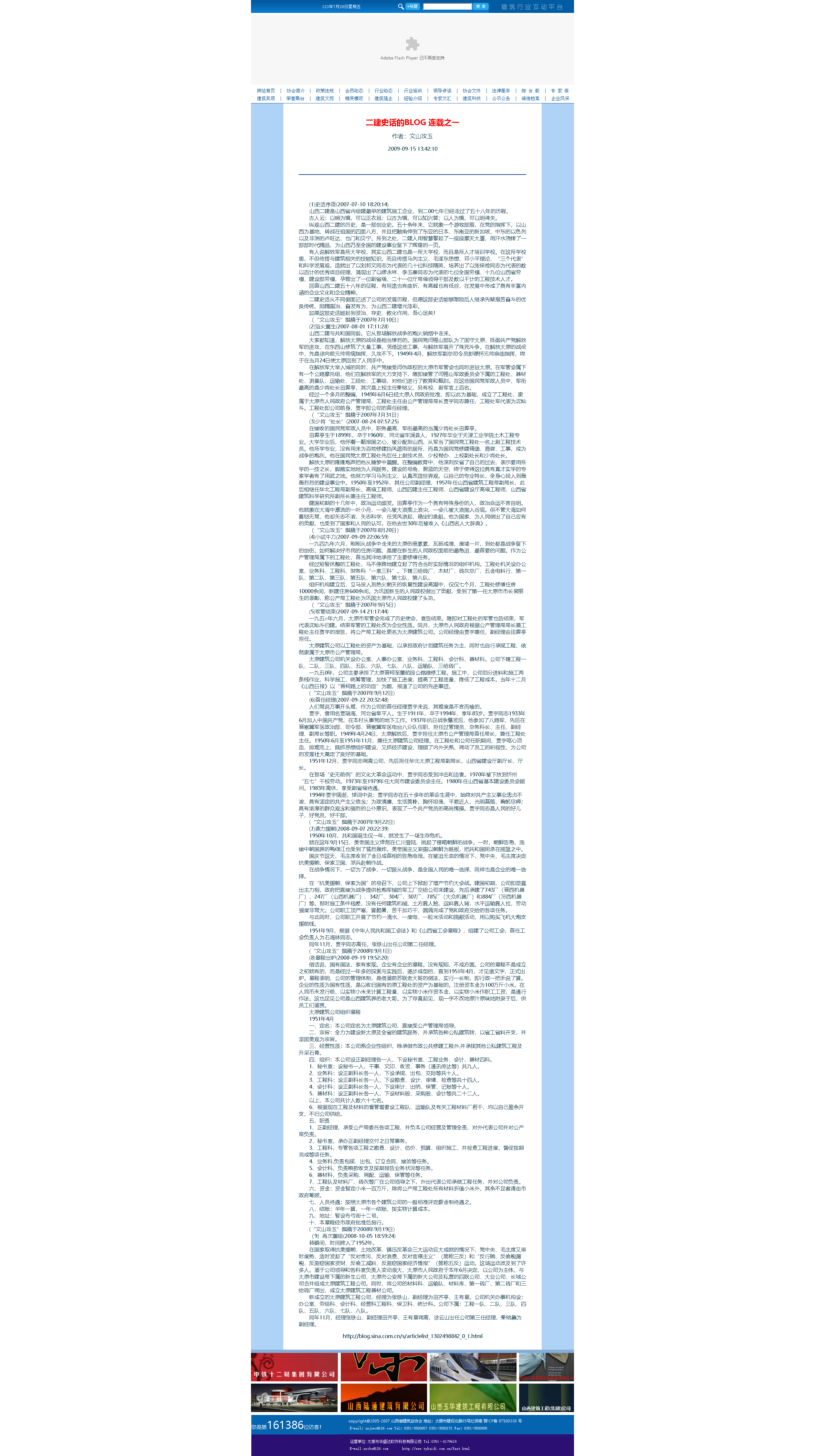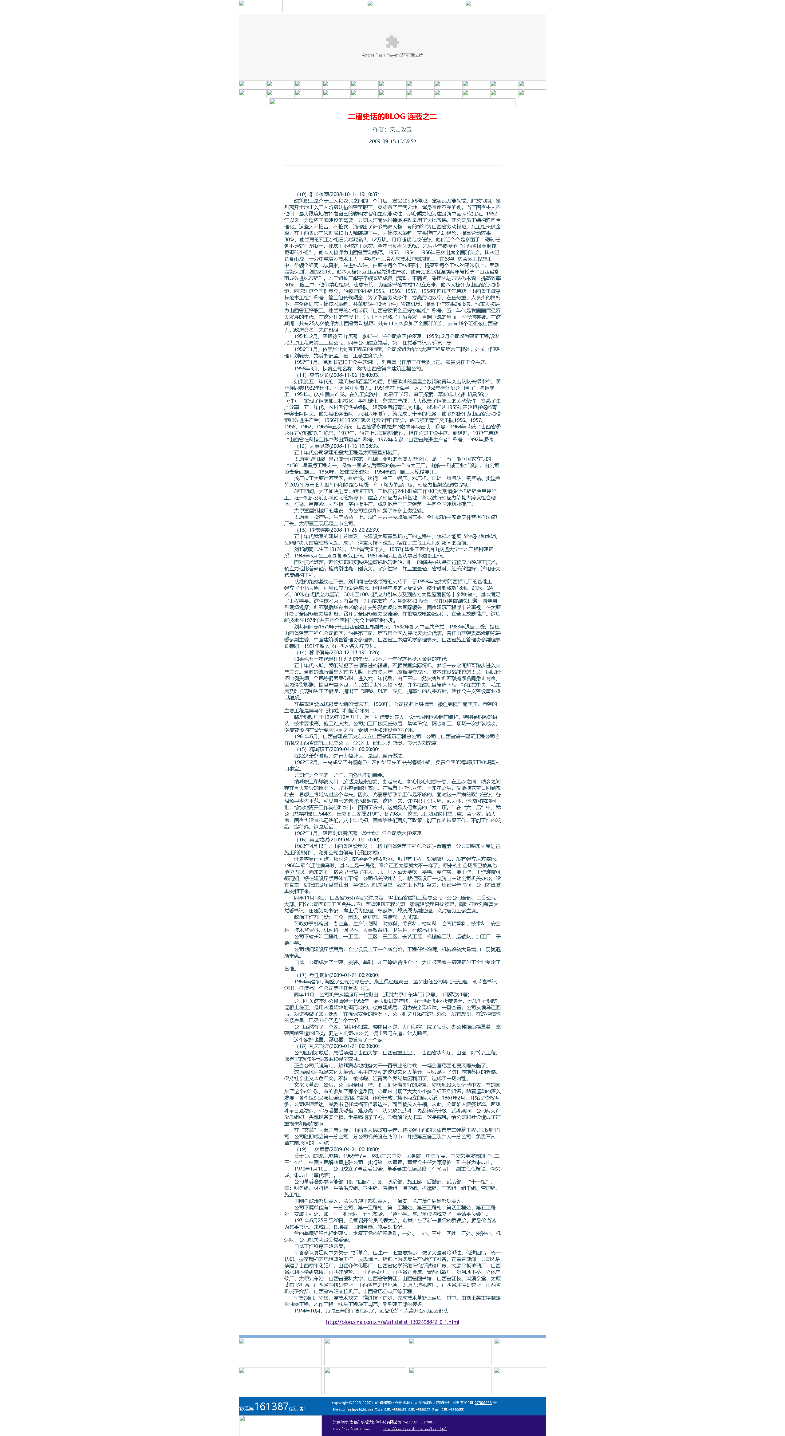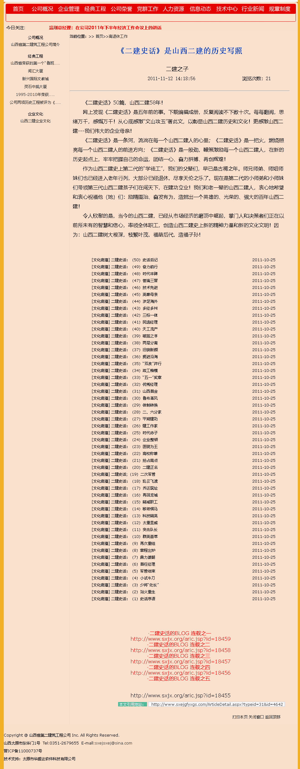 這是2009年9月15日首次在山西省建筑業協會網站全文轉發張文玉同志所撰《二建史話》五十篇。