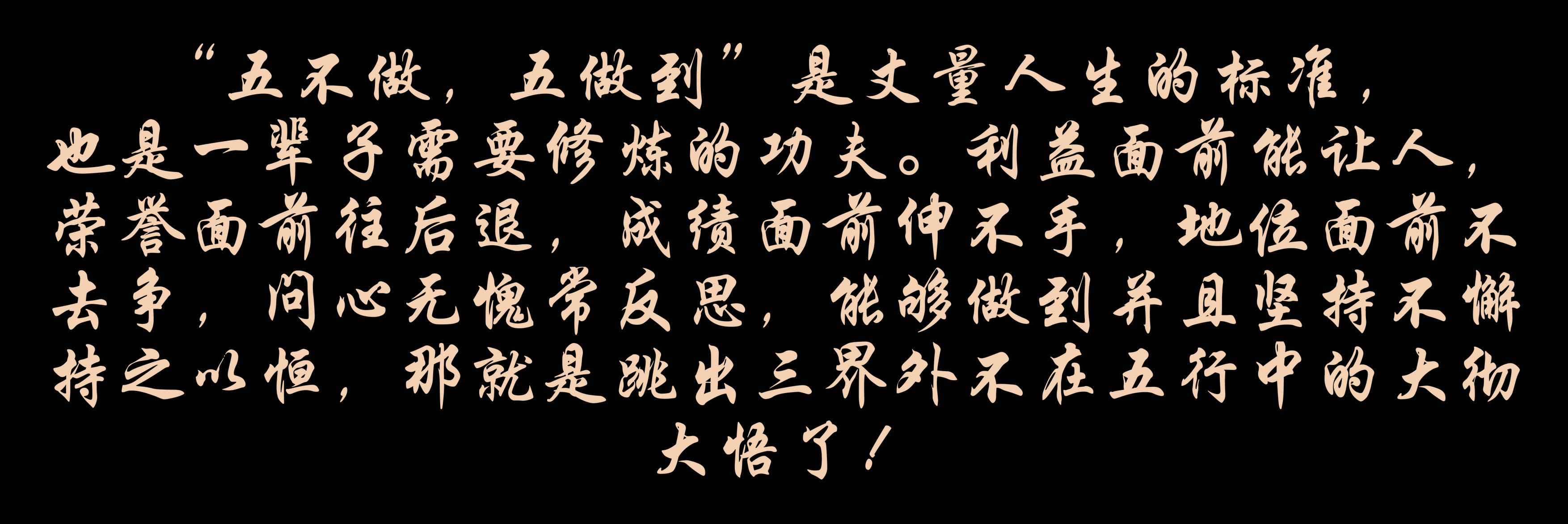 “五不做,五做到”,是丈量人生的標準,也是一輩子需要修煉的功夫。利益面前能讓人,榮譽面前往后退,成績面前不伸手,地位面前不去爭,問心無愧常反思,能夠做到并且堅持不懈持之以恒,那就是跳出三界外不在五行中的大徹大悟了!