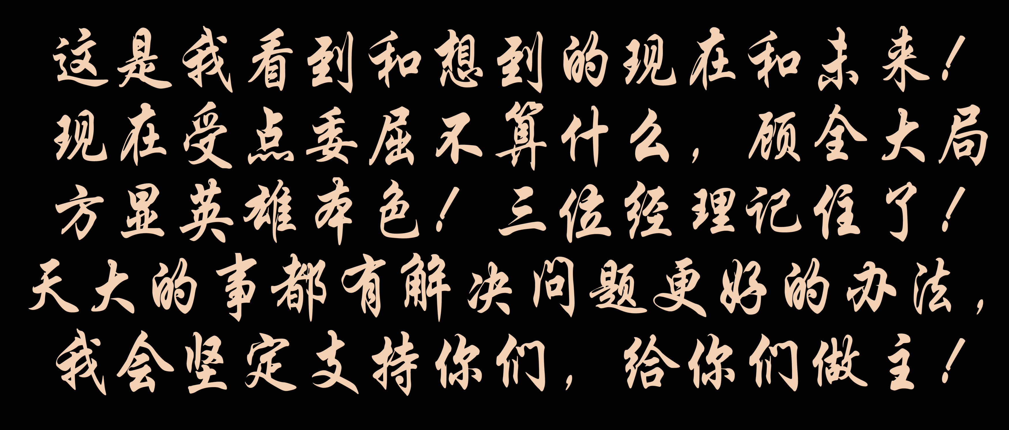 這是我看到和想到的現在和未來!現在受點委屈不算什么,顧全大局方顯英雄本色!三位經理記住了!