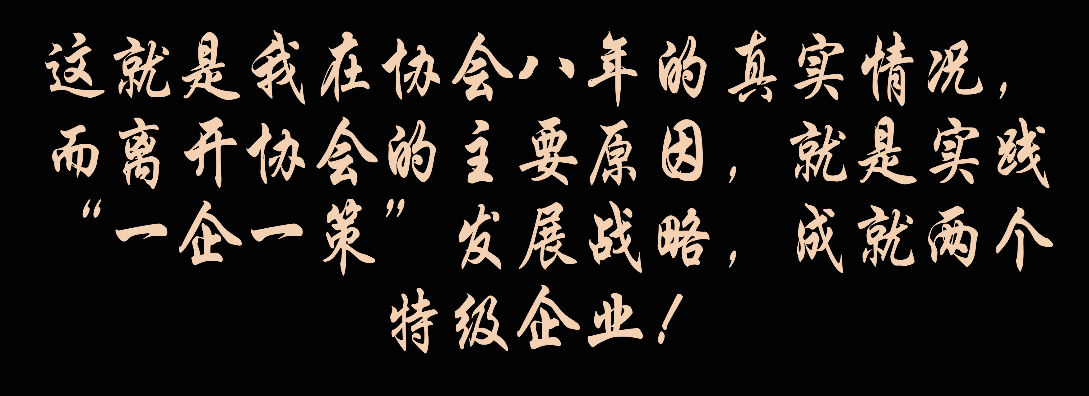 這就是我在協會八年的真實情況,而離開協會的主要原因,就是實踐“一企一策”發展戰略,成就兩個特級企業!