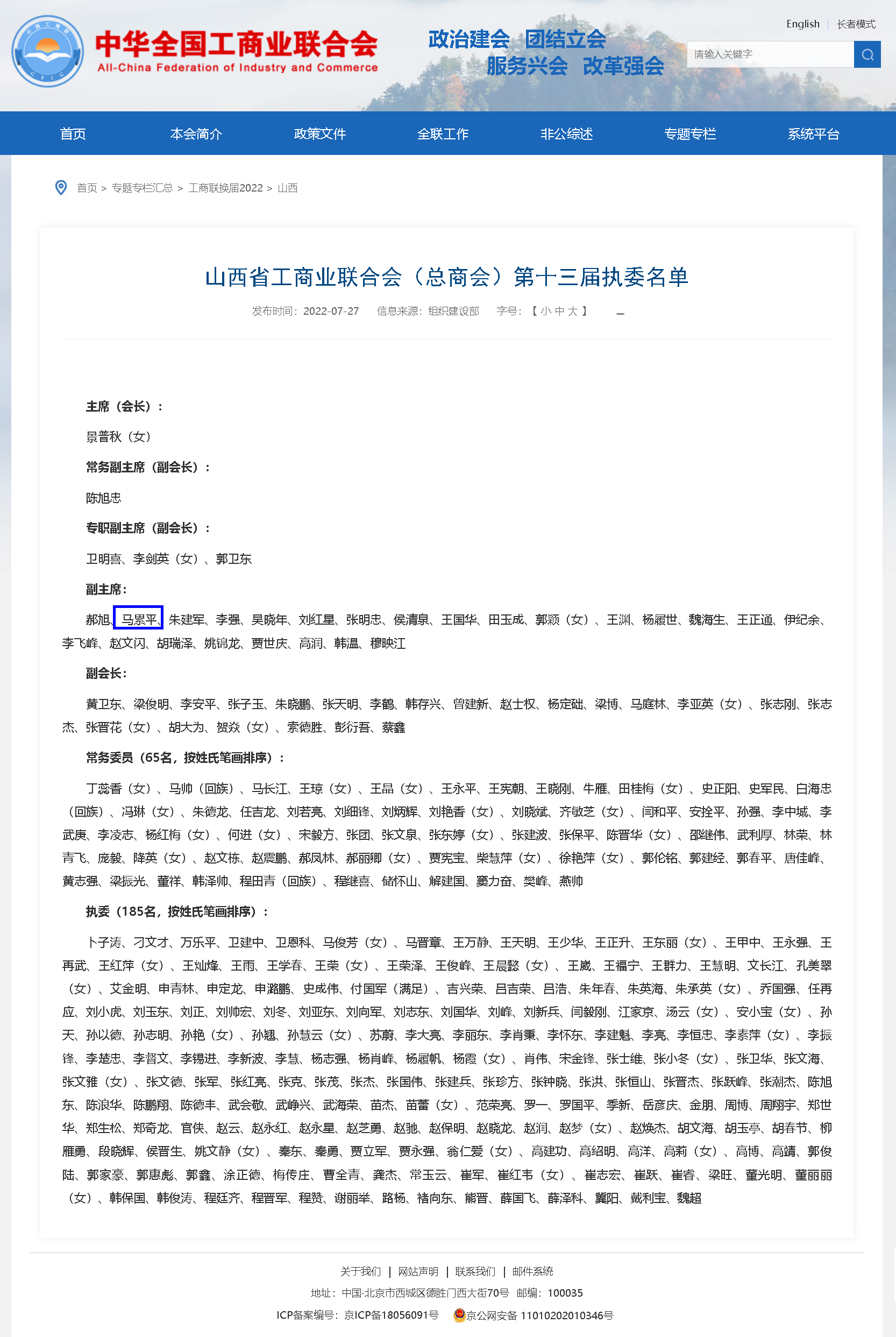 2017年——第十二屆山西省工商業聯合會副主席、山西省民營企業資產置換協會會長、山西恒圓星實業集團有限公司董事長、山西億物商務信息咨詢有限公司董事長