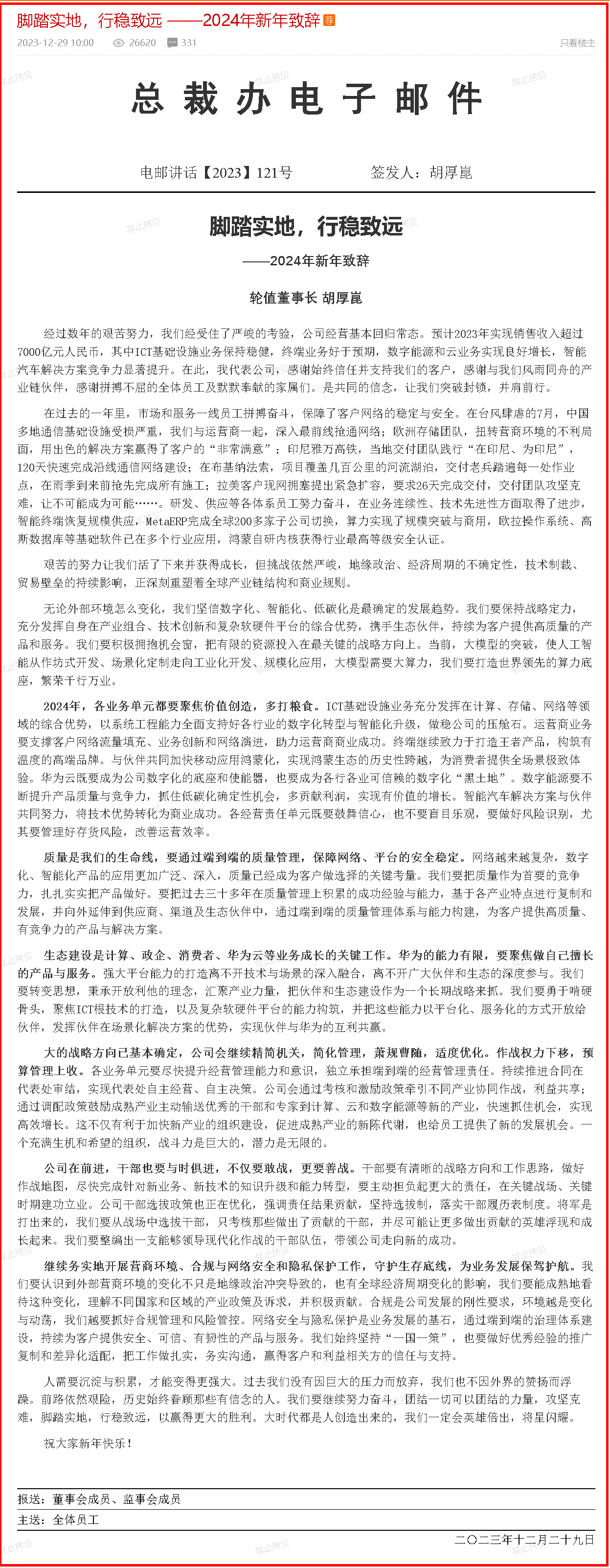 經過數年的艱苦努力,我們經受住了嚴峻的考驗,公司經營基本回歸常態。預計2023年實現銷售收入超過7000億元人民幣,其中ICT基礎設施業務保持穩健,終端業務好于預期,數字能源和云業務實現良好增長,智能汽車解決方案競爭力顯著提升。在此,我代表公司,感謝始終信任并支持我們的客戶,感謝與我們風雨同舟的產業鏈伙伴,感謝拼搏不屈的全體員工及默默奉獻的家屬們。是共同的信念,讓我們突破封鎖,并肩前行。