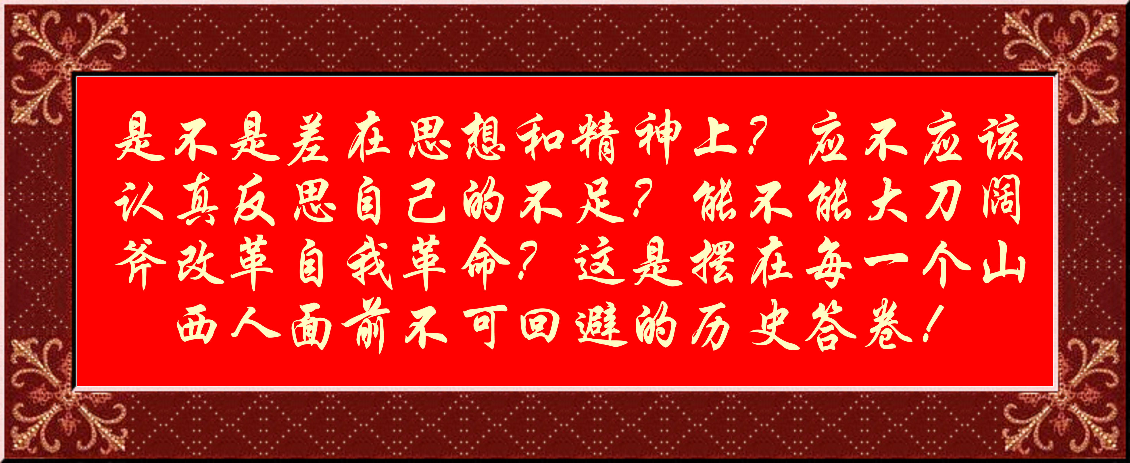 是不是差在思想和精神上?應不應該認真反思自己的不足?能不能大刀闊斧改革自我革命?這是擺在每一個山西人面前不可回避的歷史答卷!