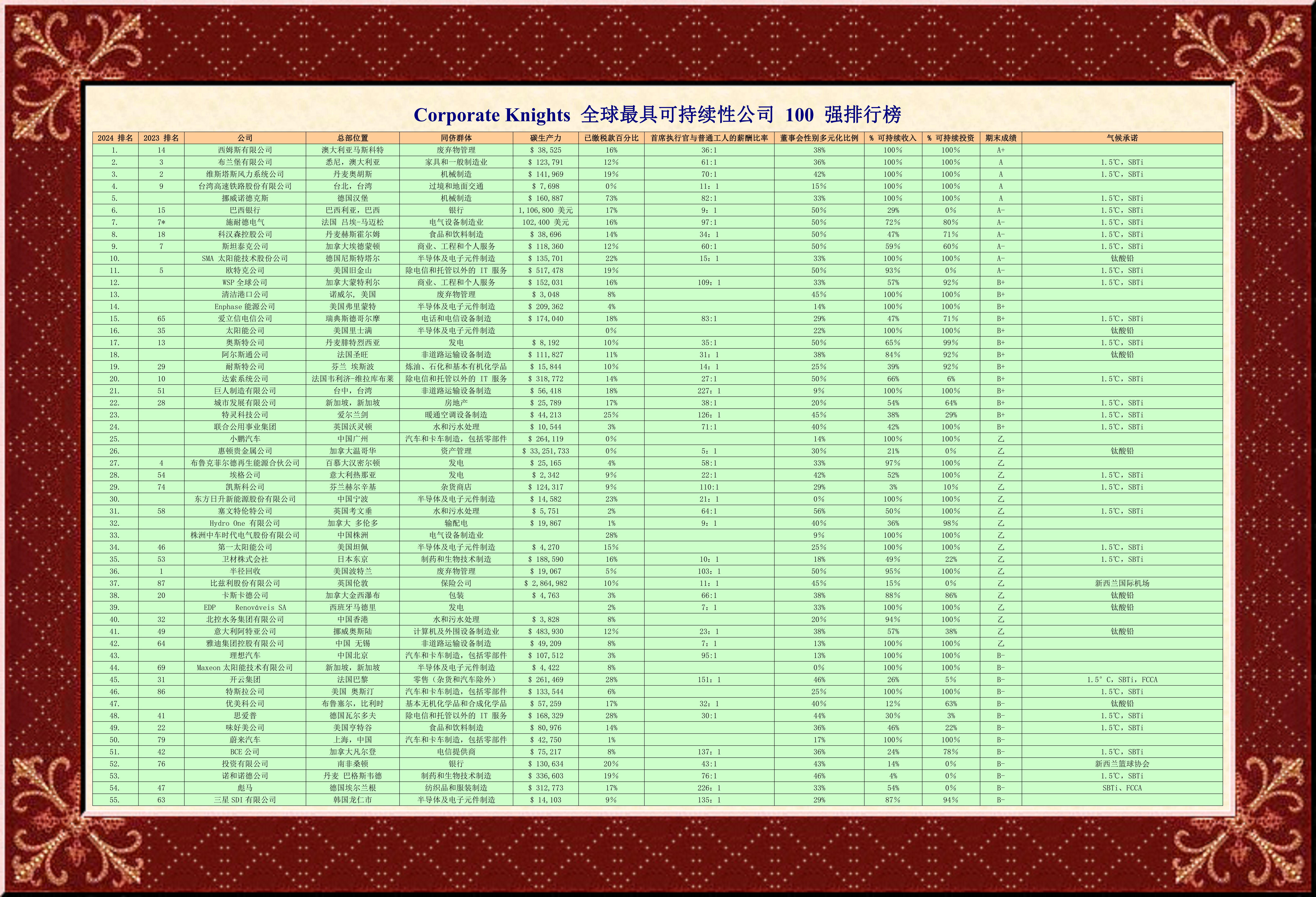 加拿大媒體和投資研究公司《企業(yè)爵士》(Corporate Knights)發(fā)布2024年“全球最佳可持續(xù)發(fā)展企業(yè)百?gòu)?qiáng)”(2024 Global 100:the world’s most sustainable companies)。企業(yè)領(lǐng)導(dǎo)者正將越來(lái)越多的收入用于加速綠色轉(zhuǎn)型的投資。在今年的100強(qiáng)中,排名靠前的公司將55%的投資分配給了可持續(xù)項(xiàng)目。