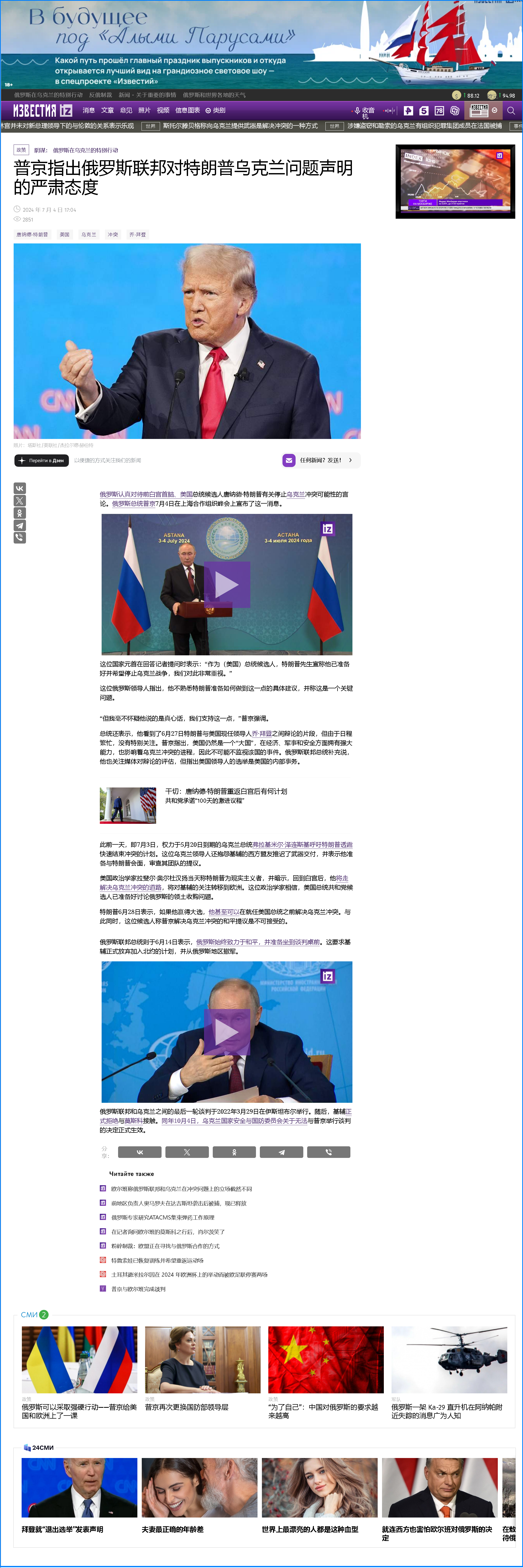 特朗普多次稱若當選就在一天內結束俄烏沖突,普京:俄方認真對待他的言論
